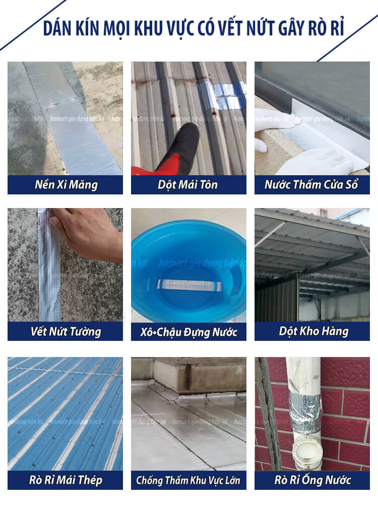 Băng keo chống thấm dán được trên mọi bề mặt mái tôn, sàn mái, tường nhà, sắt, nhựa, xi măng