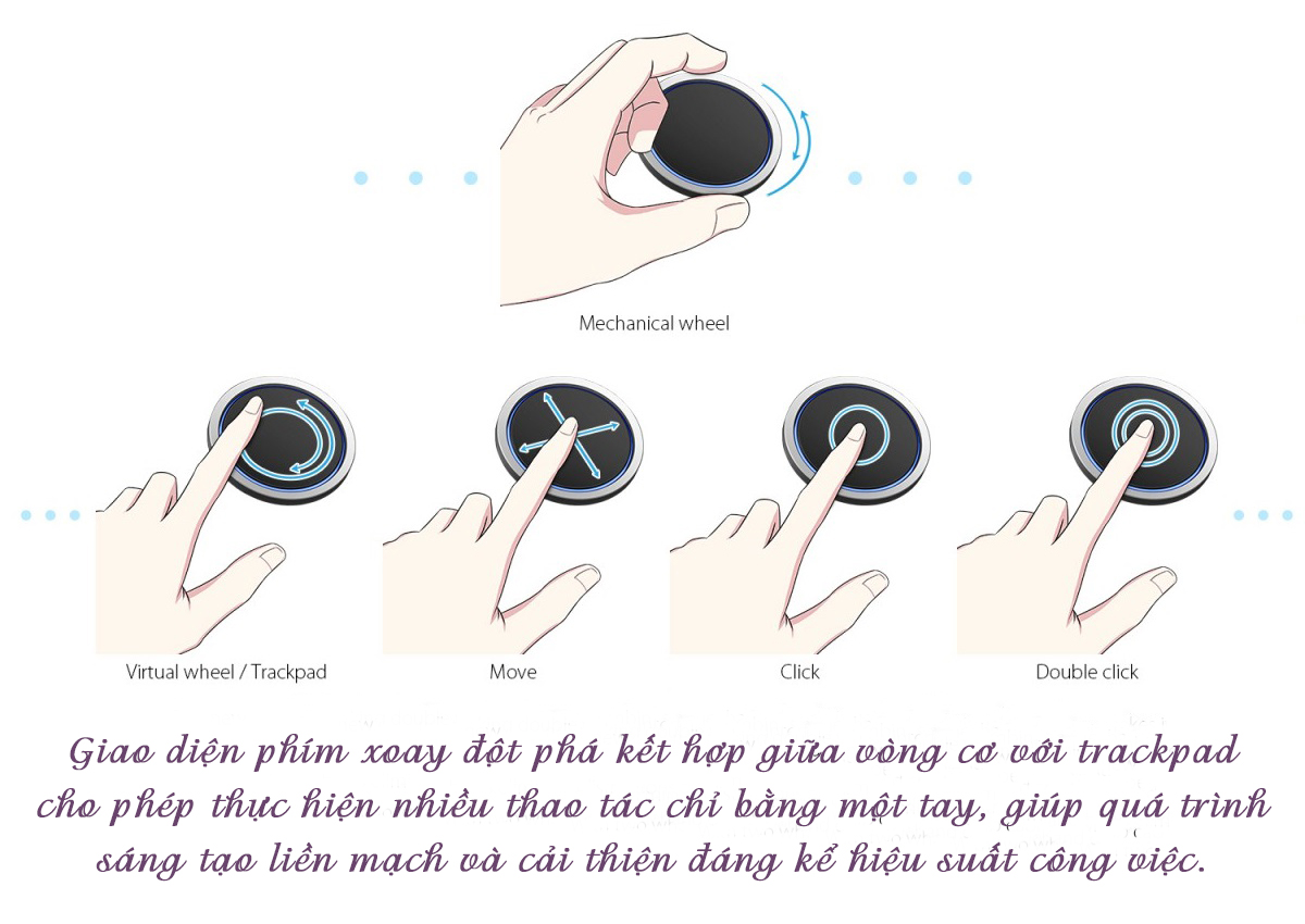 Thiết kế 2 vòng xoay với tính năng cảm ứng trackpad giúp cải thiện đáng kể trải nghiệm sử dụng với công việc sáng tạo ở cấp độ chuyên nghiệp. Giao diện mới kết hợp giữa vòng xoay cơ và vòng tròn ảo cho phép thực hiện nhiều thao tác chỉ với 1 tay và giúp loại bỏ sự xao nhãng và bị ngắt quãng trong quá trình sáng tác. Với thiết kế 2 vòng xoay độc đáo, bạn hãy khám phá thế giới sáng tạo mới: Viết, vẽ, tạo dựng và chỉnh sửa tất cả một cách mượt mà và hoàn toàn tập trung vào tác phẩm.