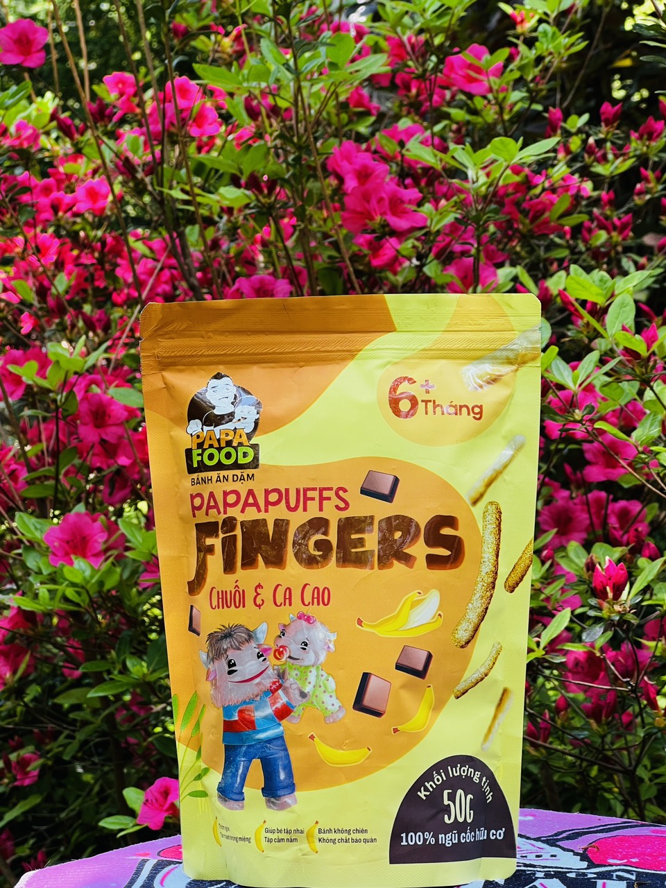 1. Tên sản phẩm: Bánh ăn dặm PAPAPUFFS FINGERS - VỊ CHUỐI VÀ CACAO . 2. Thành phần: Được sản xuất từ 100% Ngũ cốc Hữu Cơ - Gồm gạo lứt hữu cơ, gạo trắng