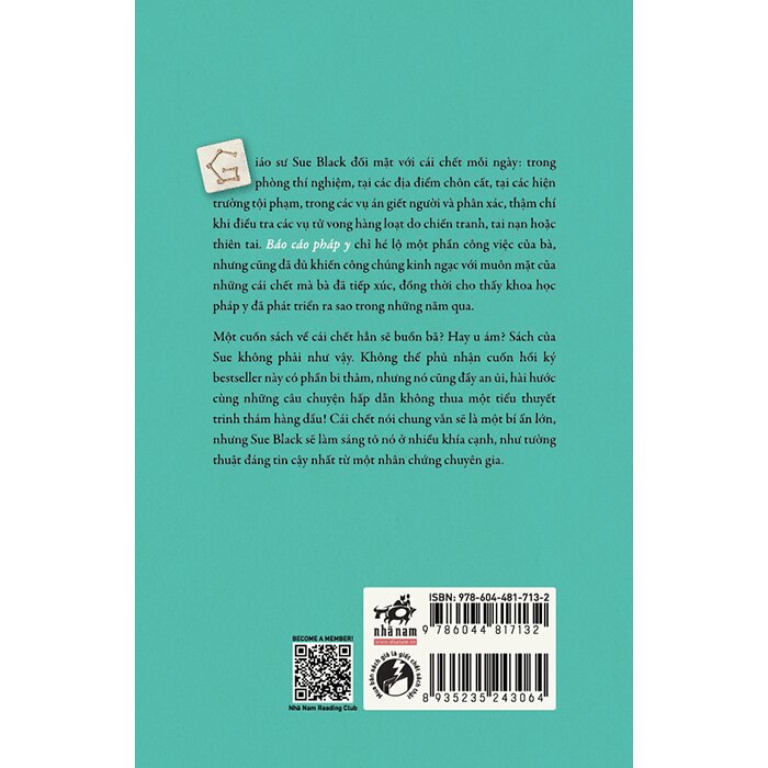 Một cuốn sách về cái chết hẳn sẽ buồn bã? Hay u ám? Sách của Sue Black không phải như vậy. Không thể phủ nhận cuốn hồi ký bestseller này có phần bi thảm, nhưng nó cũng đầy an ủi, hài hước cùng những câu chuyện hấp dẫn không thua một tiểu thuyết trinh thám hàng đầu!