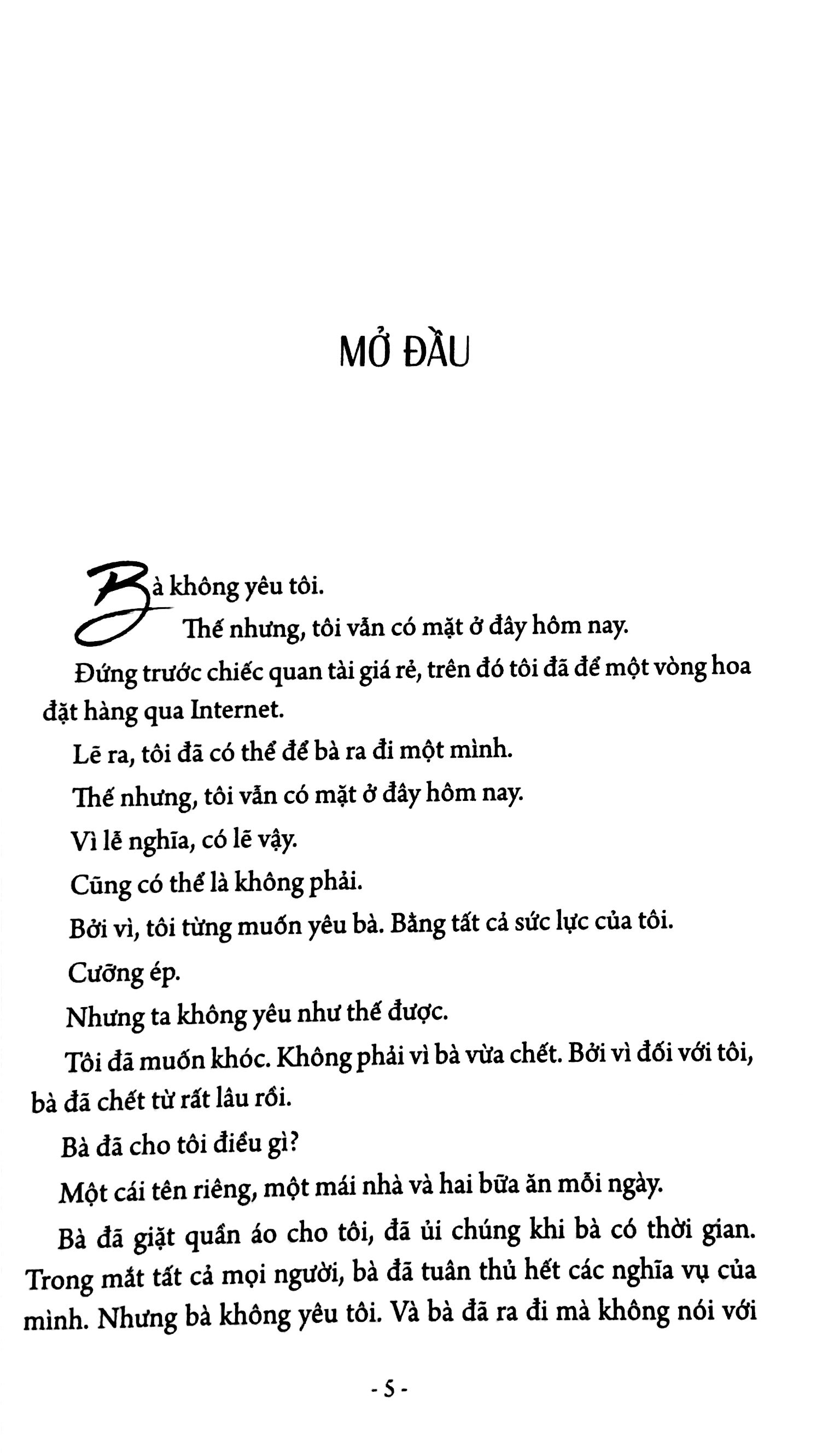 Tôi không nhớ đã bao giờ nhìn thấy nụ cười của bà chưa. Có thể bà đã từng cười, nhưng không phải là trước mặt tôi. Không phải là vì tôi.