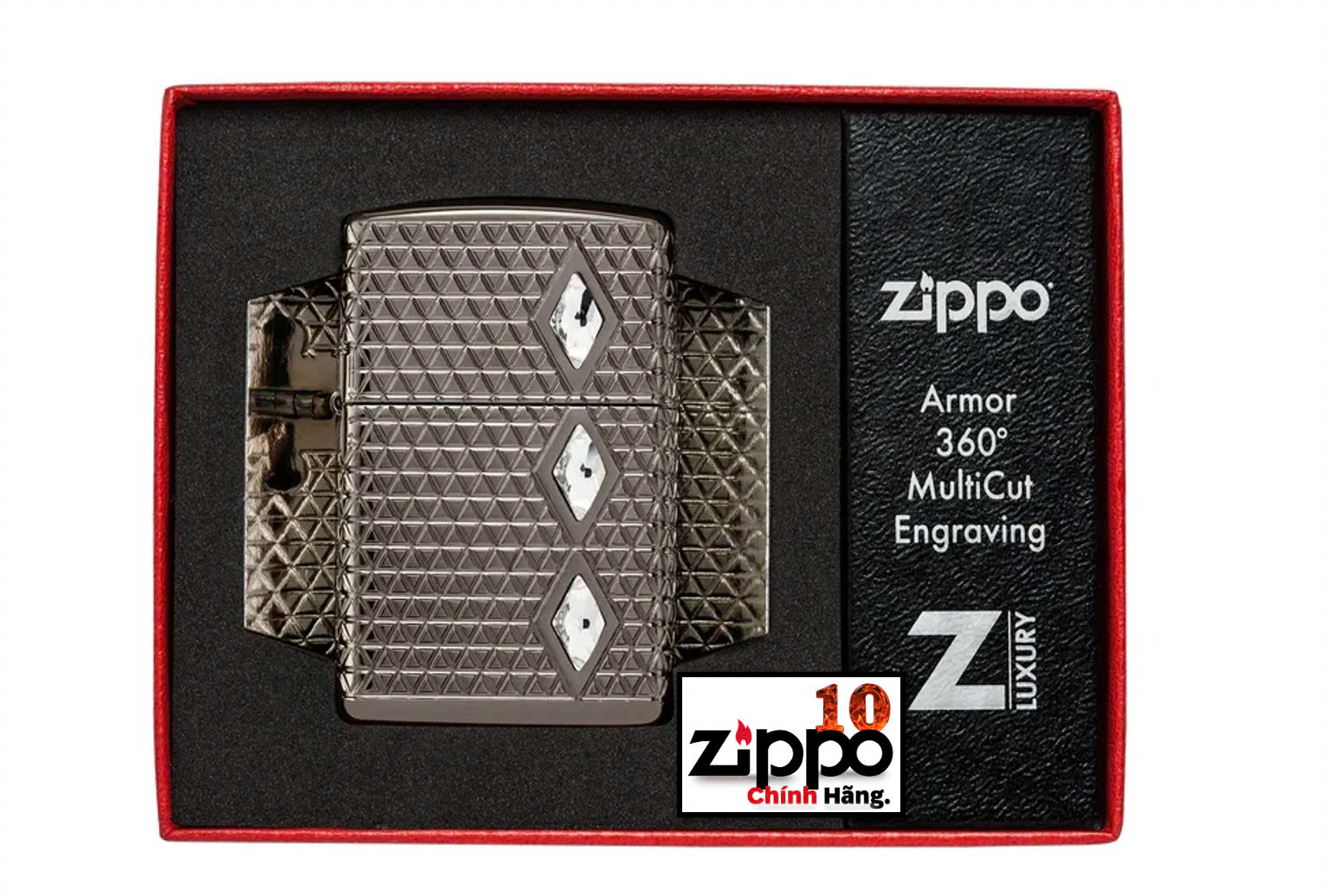 Được bao quanh bởi họa tiết kim cương MultiCut thanh lịch, ba viên pha lê lấp lánh lấp lánh trên bề mặt của chiếc bật lửa Armor Black Ice tinh xảo này. Được đóng gói trong một hộp