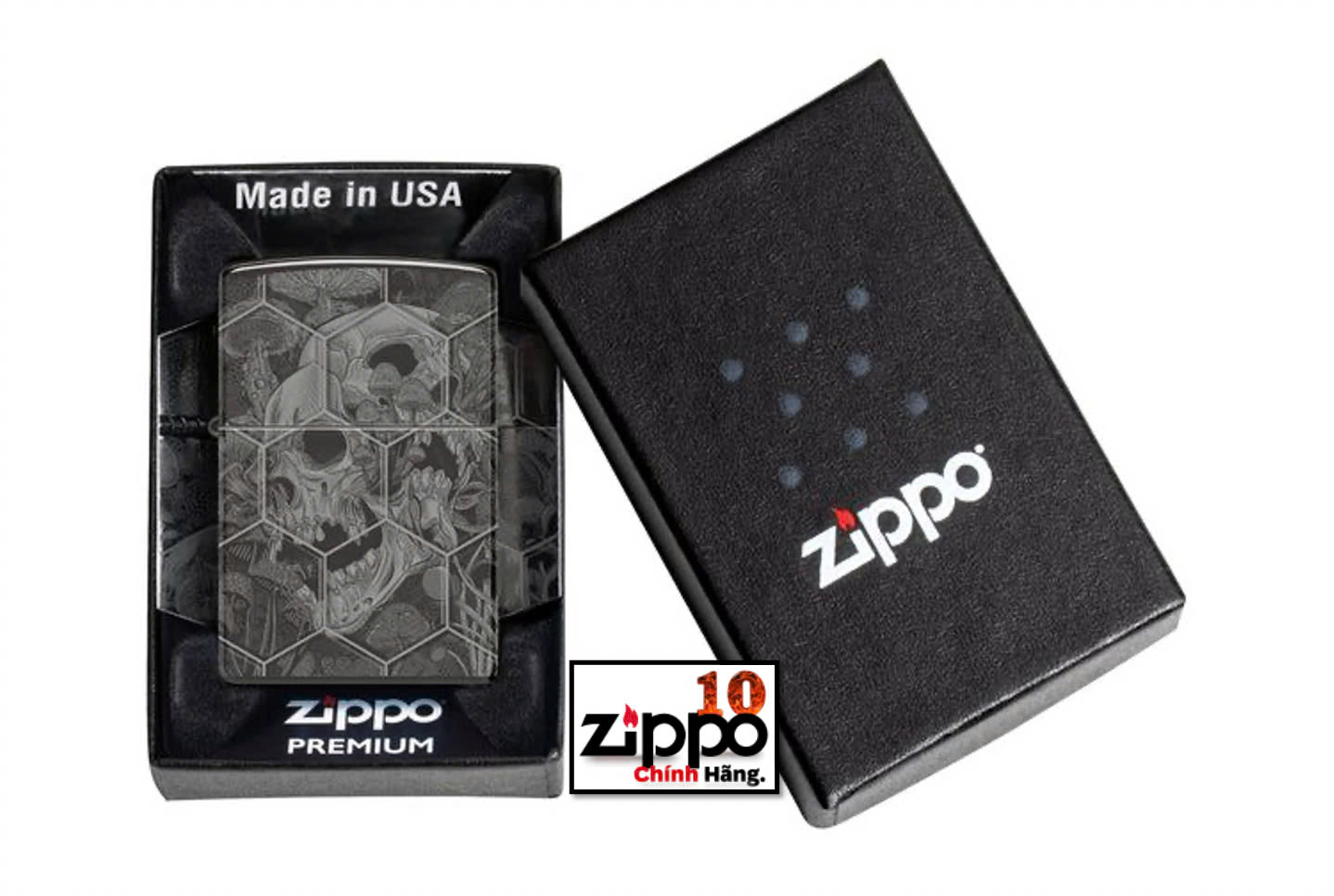 Được đóng khung theo họa tiết tổ ong phức tạp, nấm mọc ra từ những hộp sọ đang phân hủy trên mọi bề mặt của chiếc bật lửa High Polish Black cổ điển này với