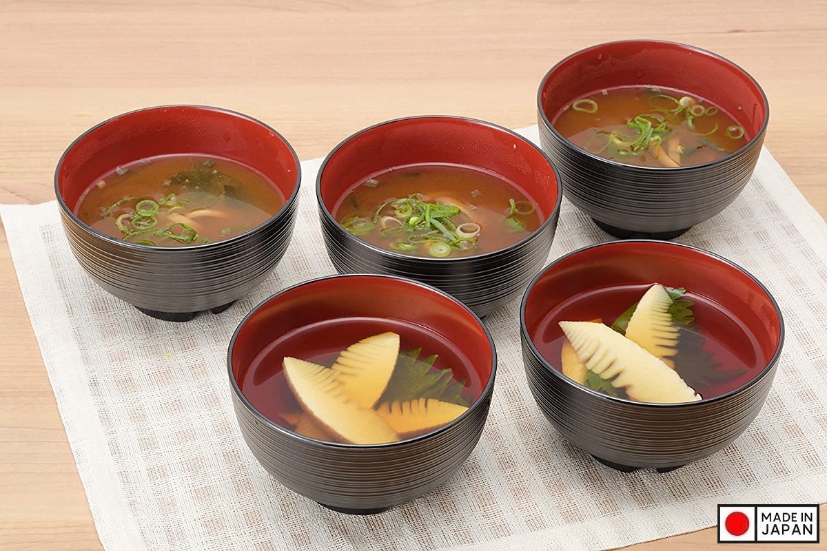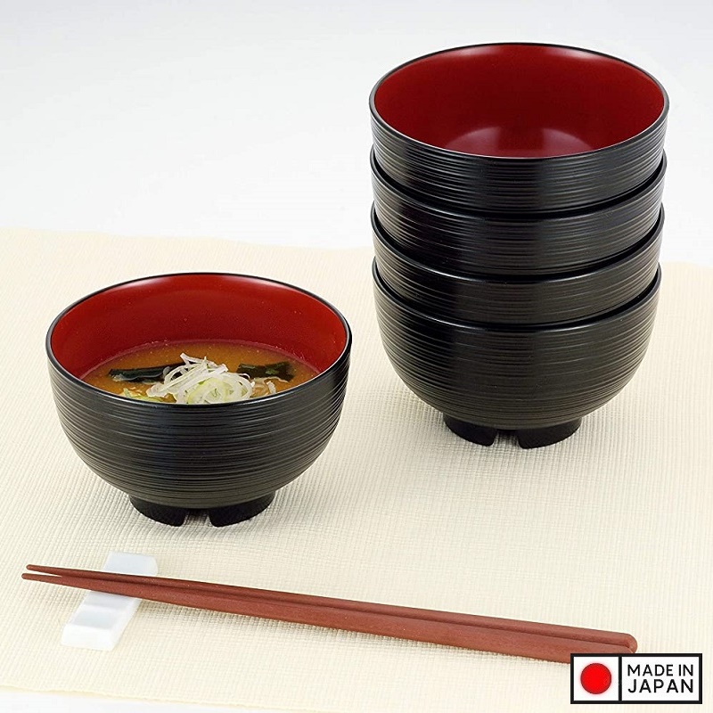 Bát tròn miệng rộng 500ml (Ø14.5×5.5cm) ■ Xuất xứ: Nhật Bản | MADE IN JAPAN ■ Kích thước:Ø145 x 55 Hmm ■ Màu sắc: Đen ~ lòng đỏ ■ Chất liệu: - Nhựa Polyester (PET) bề mặt phủ