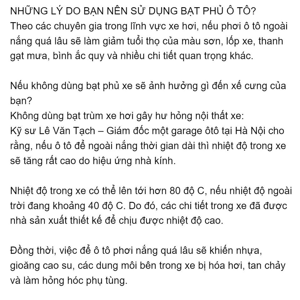 Bạt loại dày dặn, xé không rách, anh chị nào đã từng dùng bạt phủ xe ô tô, cầm vào tay là thấy khác biệt ngay ạ. Loại này chuyên dụng để ngoài trời, gió to giật mạnh không bị rách Đây là loại bản nâng cấp toàn diện so với các loại bạt tráng nhôm trên thị trường với độ dai, độ bền tăng gấp nhiều lần Có chun để dễ ôm lấy xe, ngăn bụi của gió luồn vào. Có phản quang tại 4 góc xe và hai gương để các phương tiện khác nhận biết dễ dàng khi trời tối. Có dây kéo ở cửa lái để khi bạn cần vào xe mà không cần tháo bạt.Bạt loại dày dặn, xé không rách, anh chị nào đã từng dùng bạt phủ xe ô tô, cầm vào tay là thấy khác biệt ngay ạ.