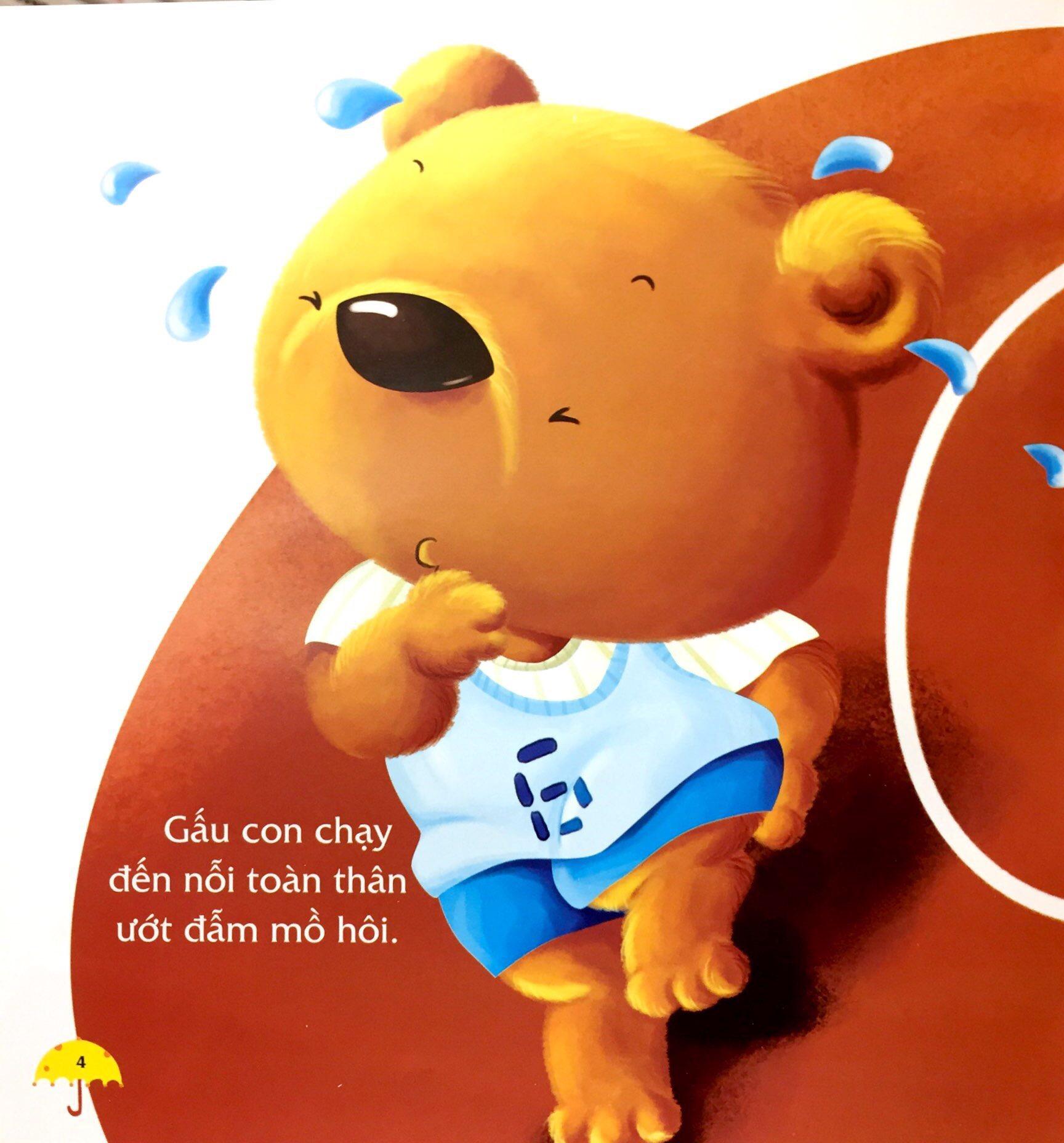 Gấu con tham gia một cuộc thi chạy. Cậu cố gắng chạy thật nhanh, mồ hôi ướt đẫm rồi kìa. Khi Gấu con sắp kiệt sức và không thể chạy tiếp được nữa, bỗng cậu nghe tiếng cổ vũ của Gấu bố. Như được tiếp thêm sức mạnh, Gấu con gắng sức chạy băng băng về đích và giành giải quán quân.