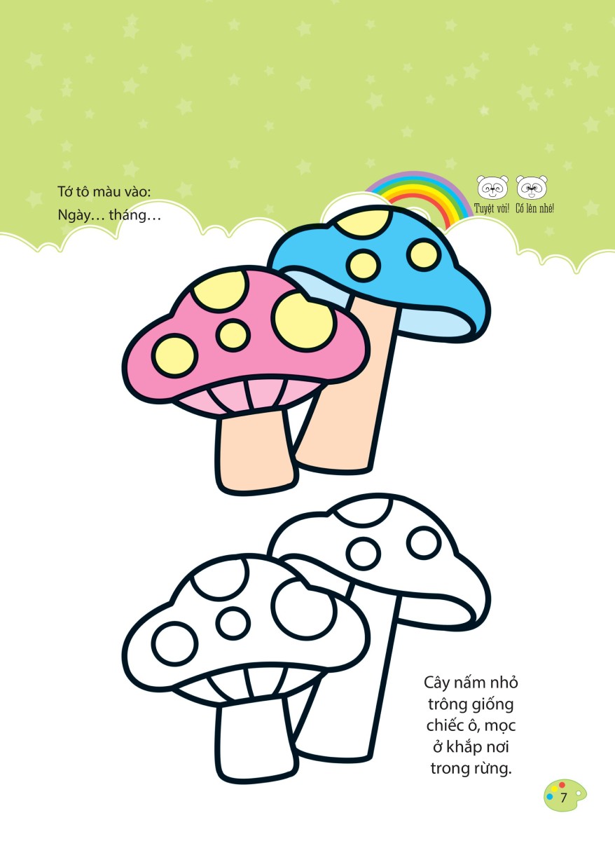 Ngoài việc tô màu theo sự sáng tạo riêng của mỗi bé, sách có gợi ý màu sắc, hình tô mẫu để các bé có thể dễ tưởng tượng và ghi nhớ được hình dạng và màu sắc.