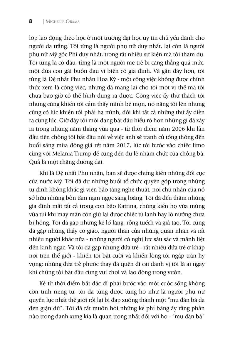 Với sự chân thực tuyệt đối và chất hóm hỉnh sống động, Michelle kể lại những thành công và cả những thất bại, cả trong chính trường lẫn cuộc sống riêng, kể lại từng lát cắt toàn bộ câu chuyện cuộc đời chính bà đã sống, đã trải qua – bằng một chất văn riêng rất Michelle cùng góc nhìn rất khác biệt.
