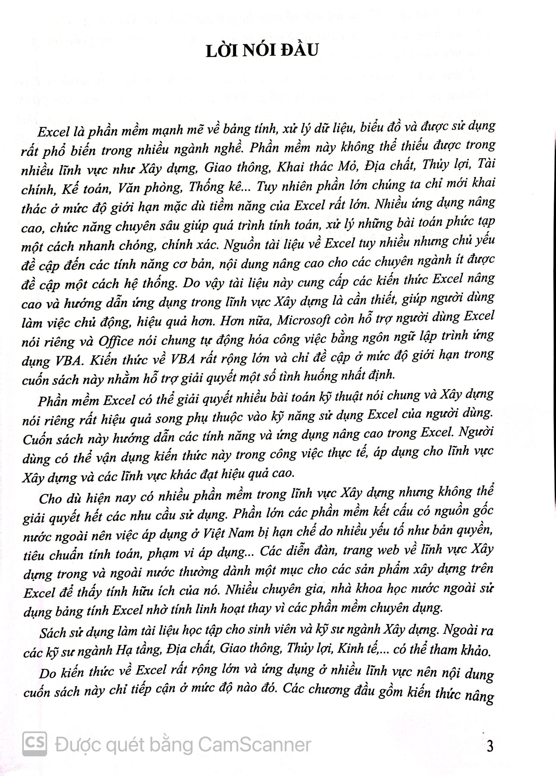 Do kiến thức về Excel rất rộng lớn và ứng dụng ở nhiều lĩnh vực nên nội dung cuốn sách này chỉ tiếp cận ở mức độ nào đó. Các chương đầu gồm kiến thức nâng cao, nội dung cuối đề cập tới một số ứng dụng trong lĩnh vực Xây dựng. Không chỉ với Xây dựng và kỹ thuật, cuốn sách này còn cung cấp kiến thức trong các lĩnh vực khác như văn phòng, nhân sự, quản trị CSDL, kế toán.