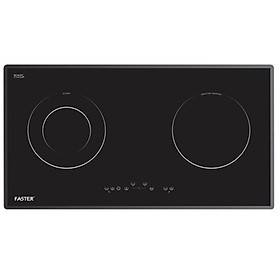 Bếp điện từ Faster FS-2SIR thiết kế 2, vùng nấu 1 vùng nấu từ + 1 vùng nấu hồng ngoại, mặt bếp bằng kính Schott-ceran sản xuất đức, bụng bếp bằng kim loại mạ kém chống rỉ, Bếp Faster 2SIR công suất tổng 3900W, điều khiển cảm ứng quang ngay cả khi tay dính nước, vùng nấu từ 1500W sử dụng Booster nấu nhanh lên 2000W, vùng nấu hồng ngoại sử dụng các loại xoong nồi đáy phẳng công suất 800W tăng tối đa 1900W tiết kiệm điện năng 30%, tính năng bảo vệ qua áp,sử dụng tính năng hẹn giờ tắt bếp,khóa phím trẻ em an toàn