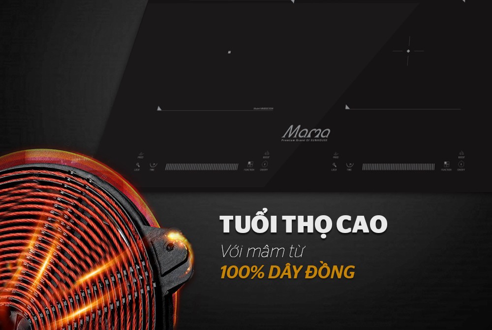 Bếp đôi điện từ SUNHOUSE MAMA MMB9201DIH với mâm từ được làm bằng 100% dây đồng siêu bền, giúp truyền nhiệt tốt và tăng tuổi thọ của bếp.