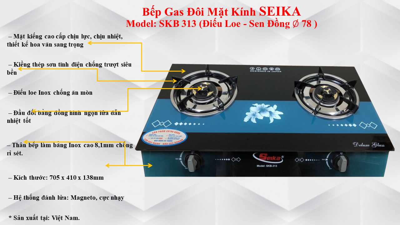 - Bếp Gas Đôi Mặt Kính Sen Đồng Seika SKB313 - Hàng Chính Hãng có thiết kế nhỏ gọn, dễ dàng phù hợp với nhiều không gian bếp, ngoài ra với bề mặt kính luôn