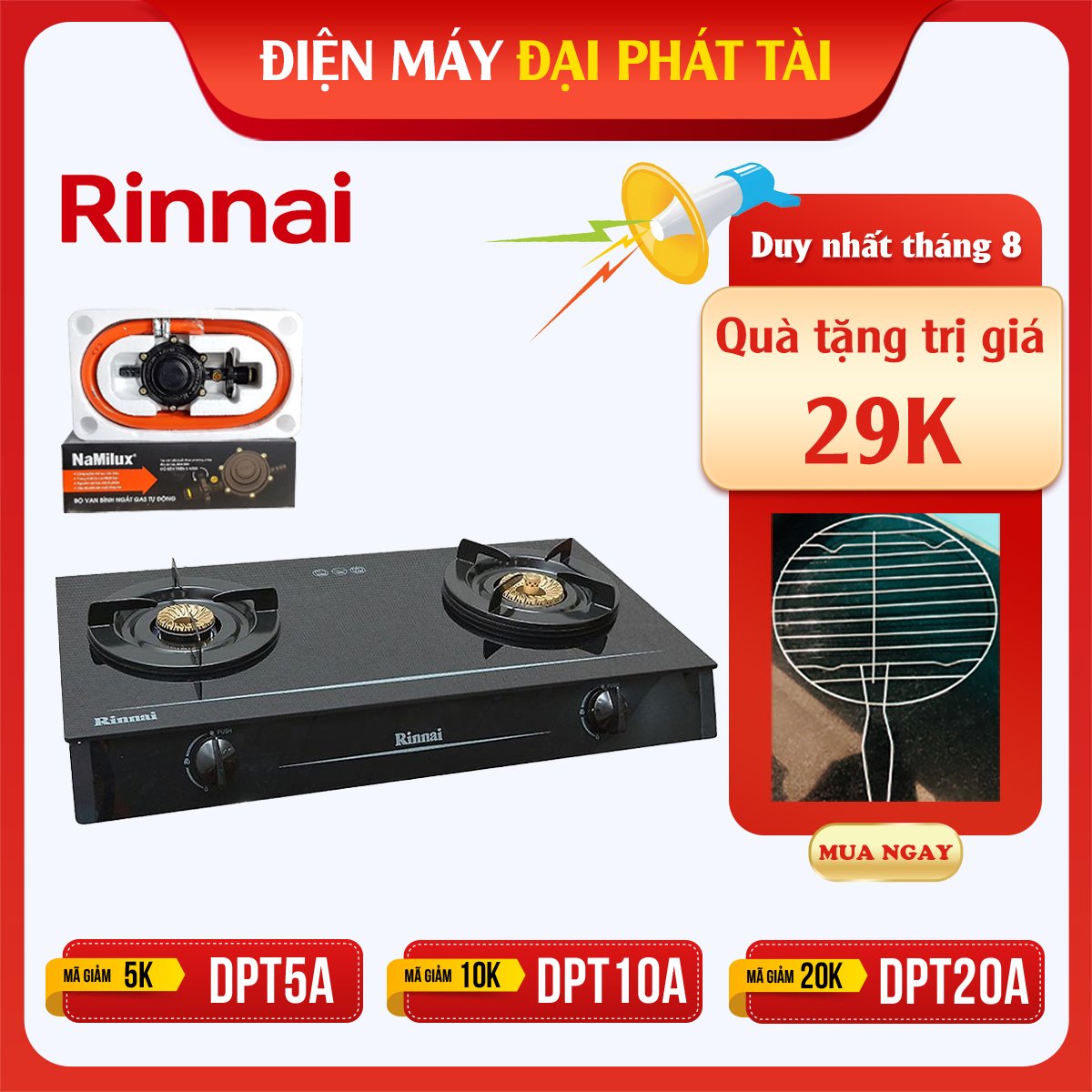 ✨Bếp Gas Dương Đôi Rinnai RV-6 Double Glass(B) Tặng kèm 1 bộ van và dây gas- Hàng chính hãng