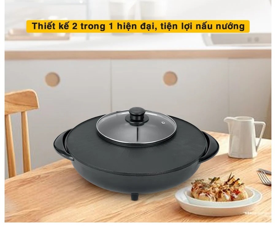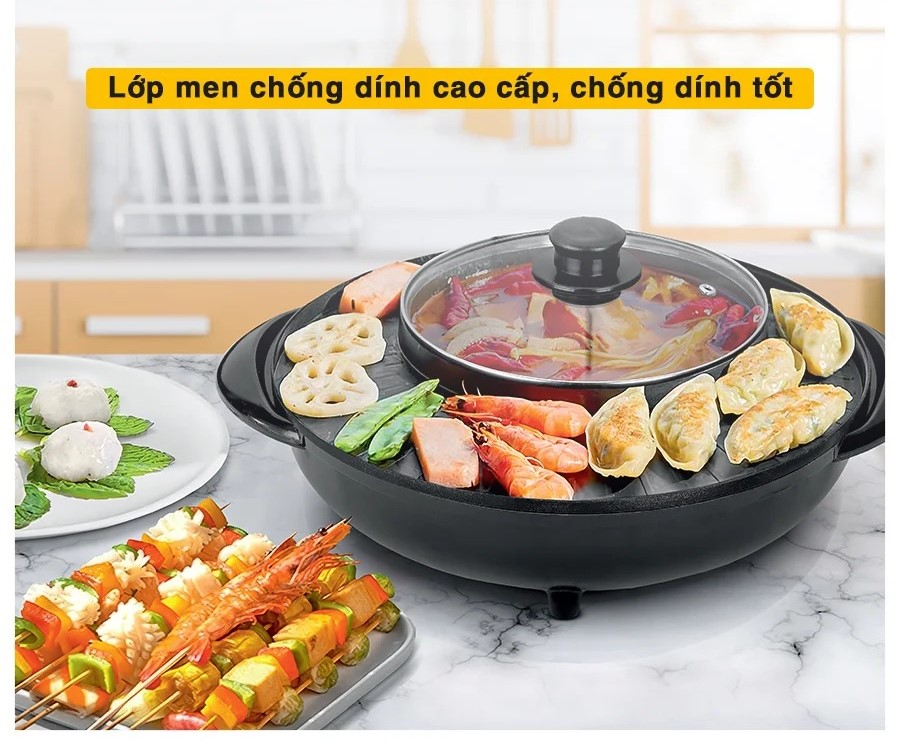 Nồi lẩu nướng điện đa năng 2 trong 1, nướng siêu chống dính cùng với lẩu 2 ngăn tiện lợi