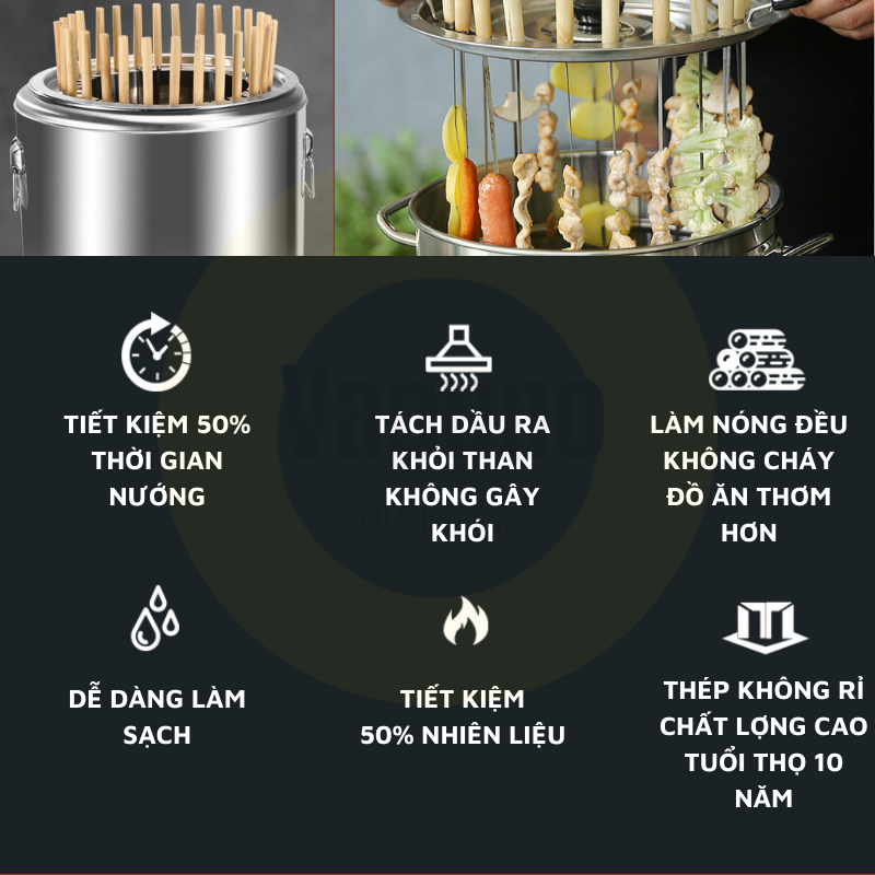 1. THÔNG TIN SẢN PHẨM - Kích thước sử dụng: 30x30x36cm - Số xiên thịt nướng cùng lúc: 20 - Chất liệu: Thép không gỉ 2. ƯU ĐIỂM: - Hạn chế