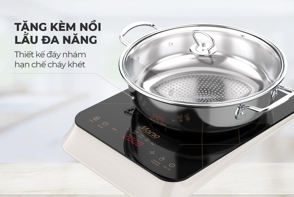 Mặt kính ceramic chịu nhiệt Mâm từ đường kính 22cm Mâm từ tự động nhận biết kích cỡ xoong nồi. Chức năng hẹn giời, chế độ xào rá Điều khiển công suất / nhiệt độ