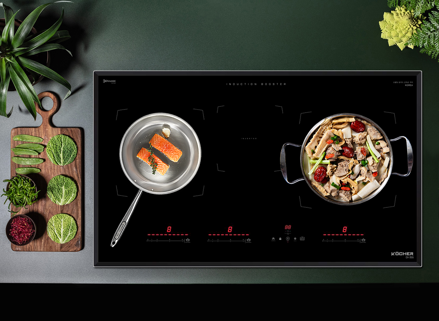 • Bếp đa điểm 04 từ • Mặt kính Schott Ceran Made in Germany siêu bền, chịu lực chịu sốc nhiệt • Bo mạch EGO Made in Germany • Đầu đốt EGO Made in Germany