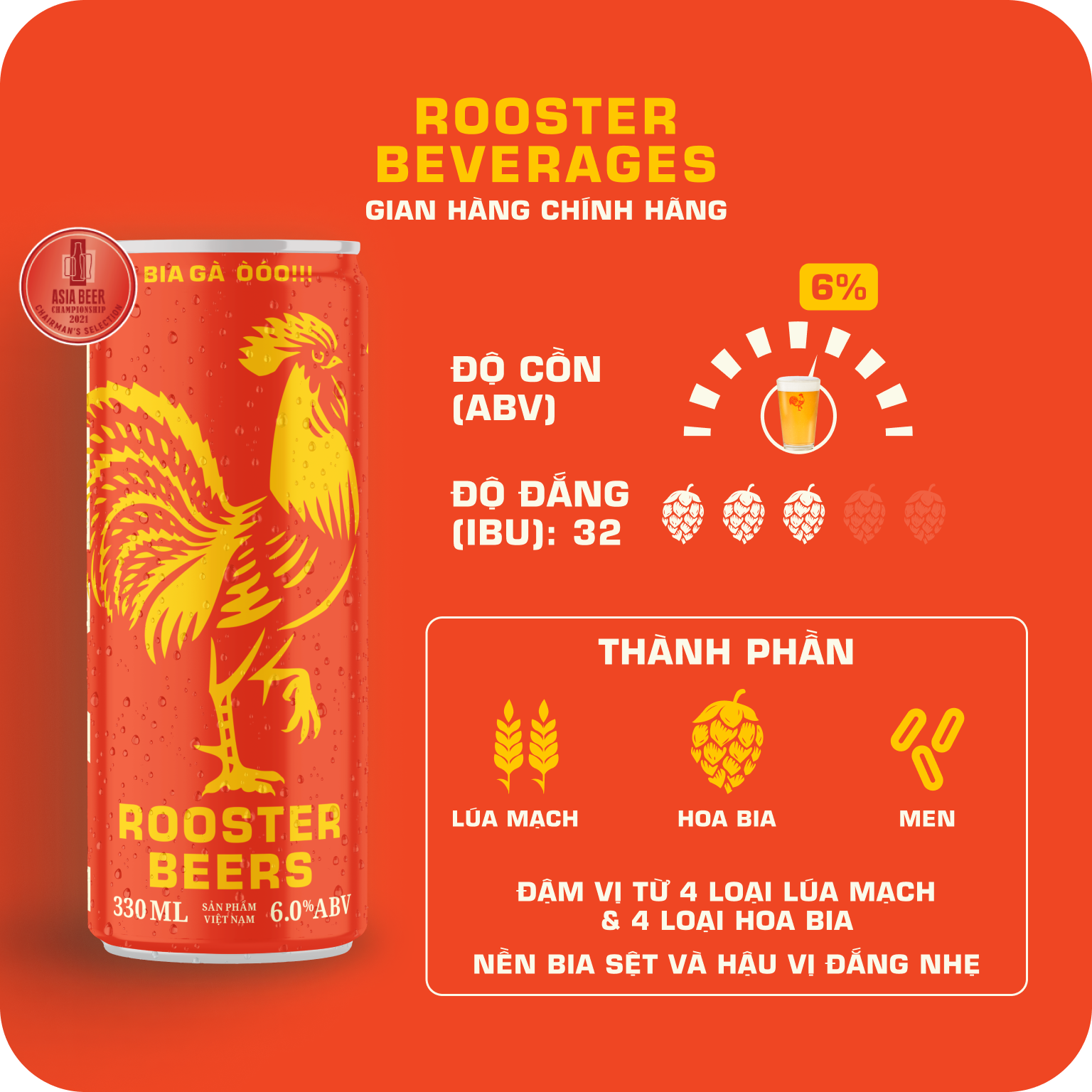 Mua tại TiktokRooster Beers Pale - Vị Nồng Nàn Dễ dàng chinh phục cả những người sành bia khó tính Rooster Pale mang đến cho bạn trải nghiệm thưởng bia tinh tế với nền bia sệt quấn quýt nơi đầu lưỡi, hậu vị đắng nhẹ và hương hoa bia nồng nàn. Ghi chú • Bia Pale phong cách Mỹ • Được nấu từ 4 loại lúa mạch và 4 loại hoa bia • Nền bia sệt. Hậu vị đắng nhẹ • 6.0% ABV – 32 IBU • Dùng kèm các món nướng: xúc xích, hải sản và thịt bò. VỀ ROOSTER BEERS: Là những chuyên gia nấu bia đầy đam mê, sáng tạo và nhiệt huyết, chúng tôi mong muốn mang đến cho khách hàng những dòng bia thủ công mang hương vị cổ điển tuyệt hảo. Mỗi ngụm bia Rooster mát lạnh sẽ là một trải nghiệm thuởng thức đáng nhớ, kể cả đối với những người sành bia lâu năm.