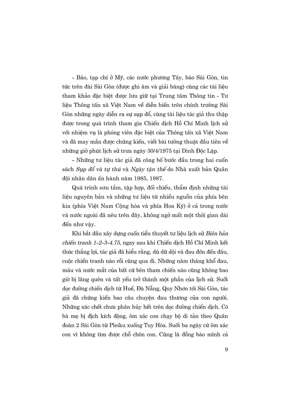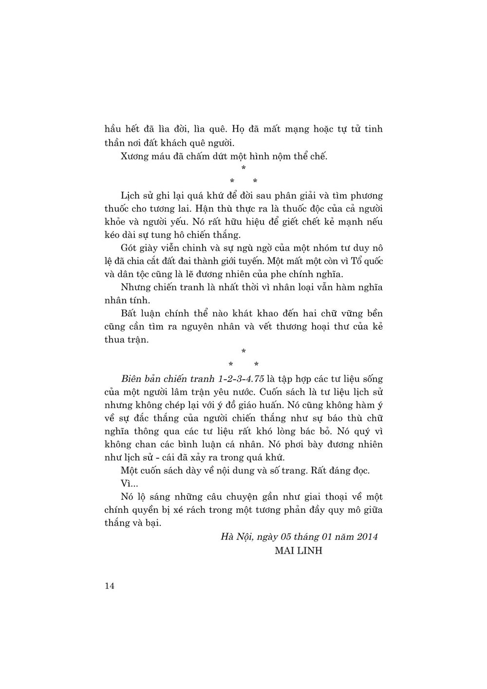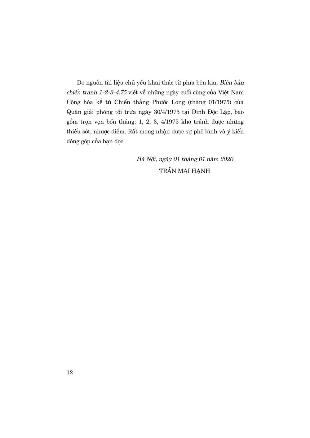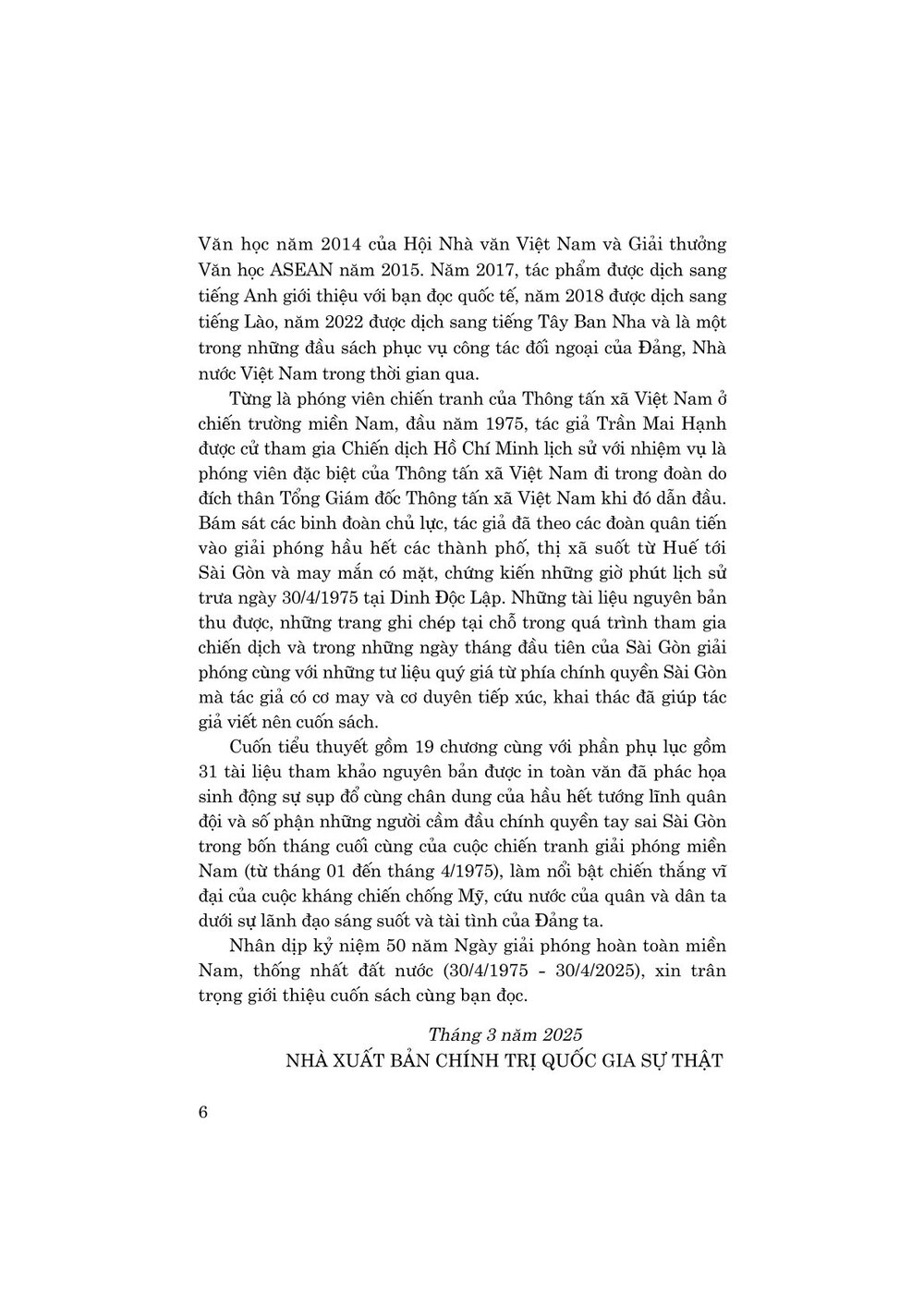 Nhằm đáp ứng yêu cầu của bạn đọc, nhân dịp kỷ niệm 50 năm Ngày giải phóng miền Nam, thống nhất đất nước (30/4/1975 - 30/4/2025), Nhà xuất bản Chính trị quốc gia Sự thật xuất bản lần thứ sáu cuốn tiểu thuyết tư liệu lịch sử Biên bản chiến tranh 1-2-3-4.75 của nhà báo, nhà văn Trần Mai Hạnh.
