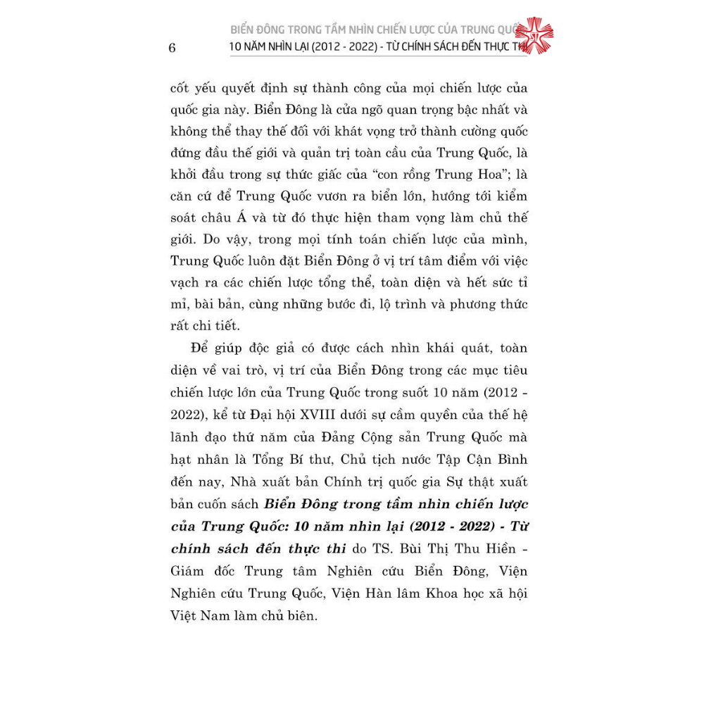 Để giúp độc giả có được cách nhìn khái quát, toàn diện về vai trò, vị trí của Biển Đông trong các mục tiêu chiến lược lớn của Trung Quốc trong suốt 10 năm (2012 - 2022), kể từ Đại hội XVIII dưới sự cầm quyền của thế hệ lãnh đạo thứ năm của Đảng Cộng sản Trung Quốc mà hạt nhân là ông Tổng Bí thư, Chủ tịch nước Tập Cận Bình đến nay, Nhà xuất bản Chính trị quốc gia Sự thật xuất bản cuốn sách Biển Đông trong tầm nhìn chiến lược của Trung Quốc: 10 năm nhìn lại (2012 - 2022) - Từ chính sách đến thực thi do TS. Bùi Thị Thu Hiền - Giám đốc Trung tâm Nghiên cứu Biển Đông, Viện Nghiên cứu Trung Quốc, Viện Hàn lâm Khoa học xã hội Việt Nam làm chủ biên.