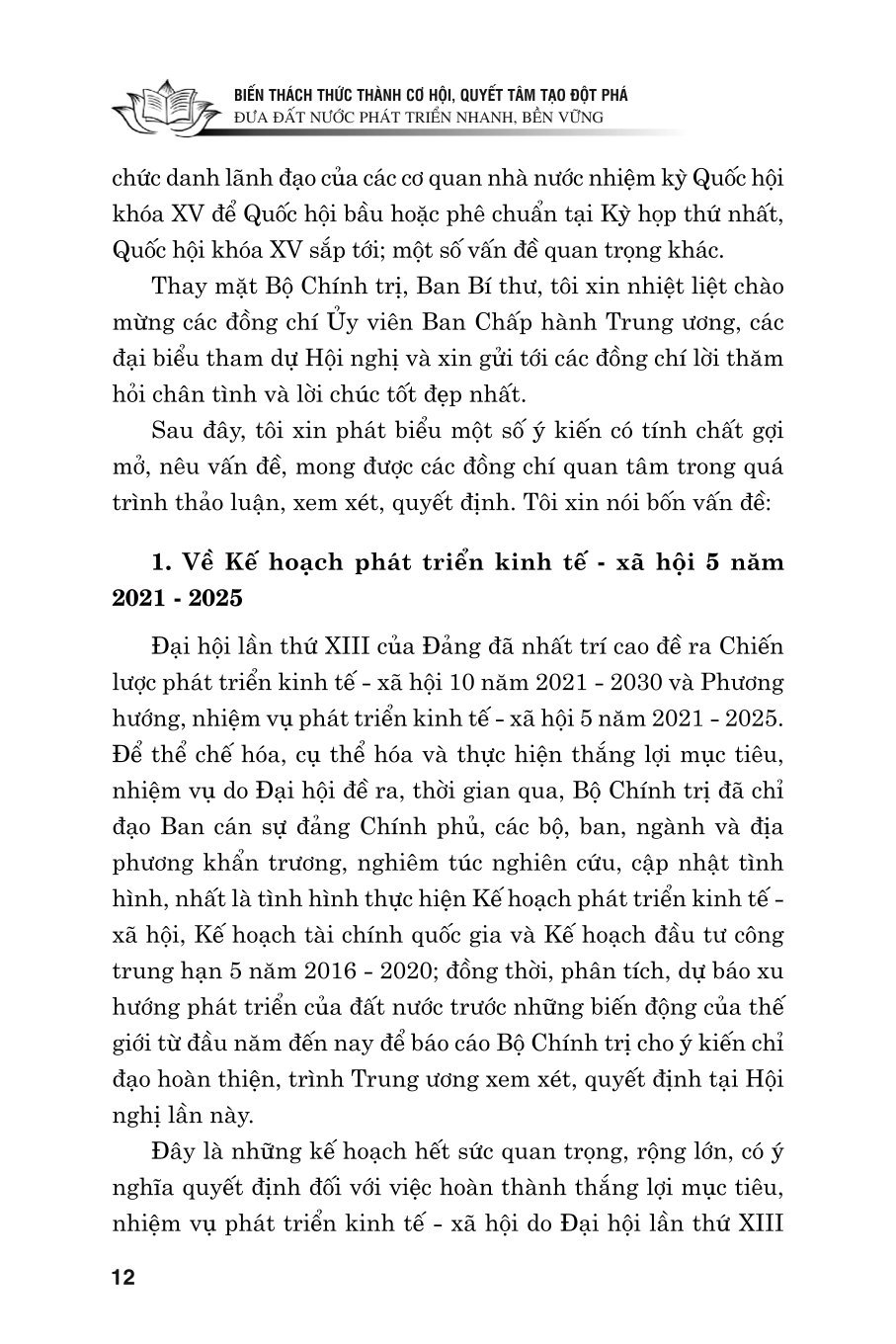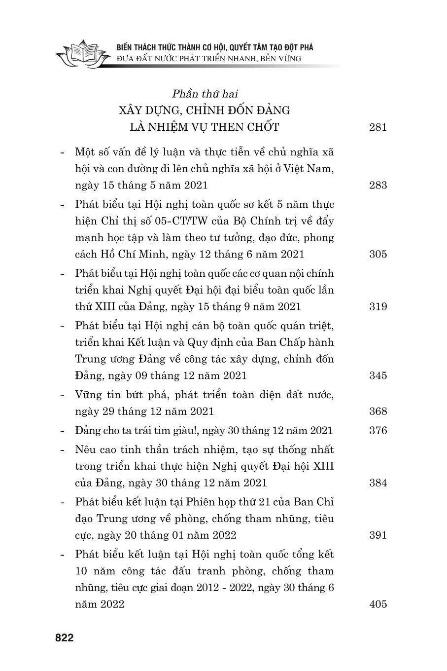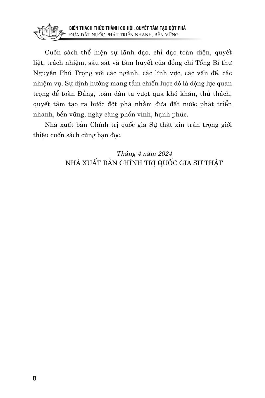 Cuốn sách “Biến thách thức thành cơ hội, quyết tâm tạo đột phá đưa đất nước phát triển nhanh, bền vững” tuyển chọn các bài phát biểu, bài viết, bài trả lời phỏng vấn, thư,