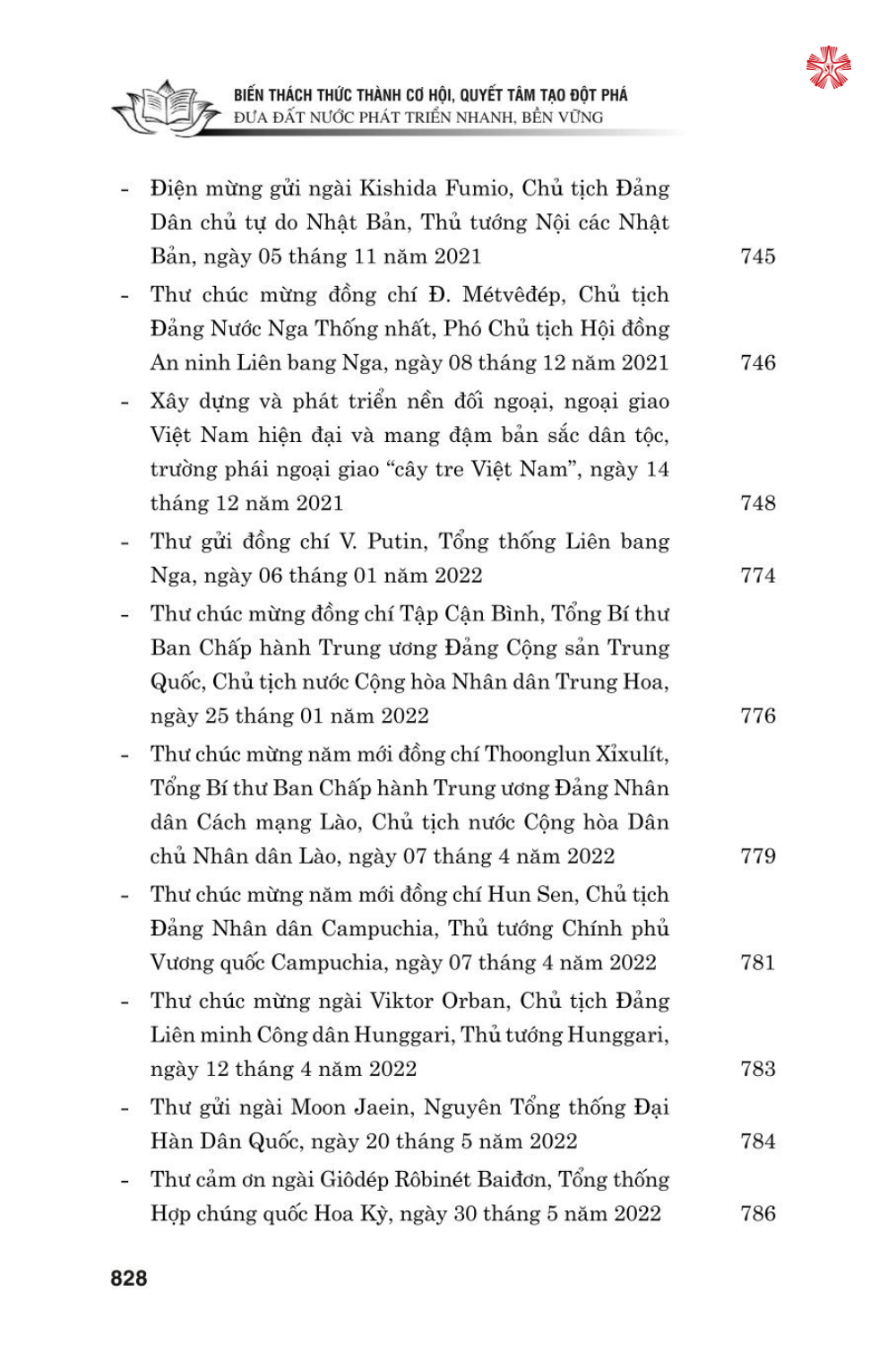 Cuốn sách “Biến thách thức thành cơ hội, quyết tâm tạo đột phá đưa đất nước phát triển nhanh, bền vững” tuyển chọn các bài phát biểu, bài viết, bài trả lời phỏng vấn, thư,