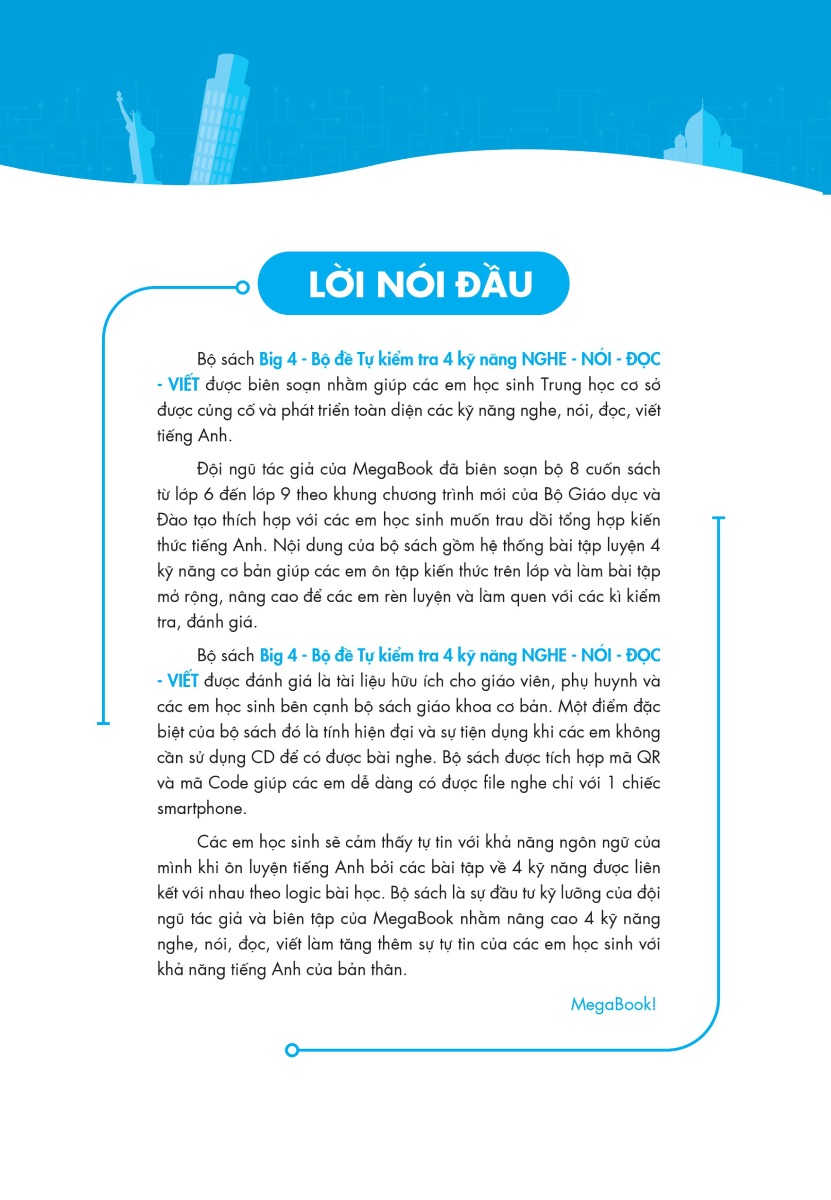 MegaBook hi vọng rằng bộ sách Big 4 bộ đề tự kiểm tra 4 kỹ năng Nghe - Nói - Đọc - Viết tiếng Anh sẽ làm tăng thêm sự tự tin của các em học sinh với khả năng tiếng Anh của bản thân.