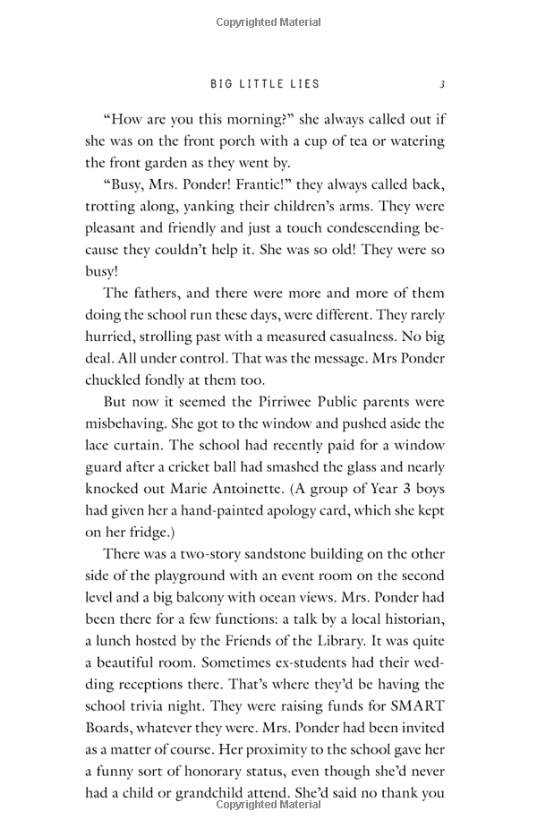 Jane hasn't lived anywhere for longer than six months since her son was born five years ago. She keeps moving in an attempt to escape her past. Now the idyllic coastal town of Pirriwee has pulled her to its shores and Jane feels as if she finally belongs. She finds friends in the feisty and the incredibly beautiful Celeste, two women with seemingly perfect lives - and their own secrets.