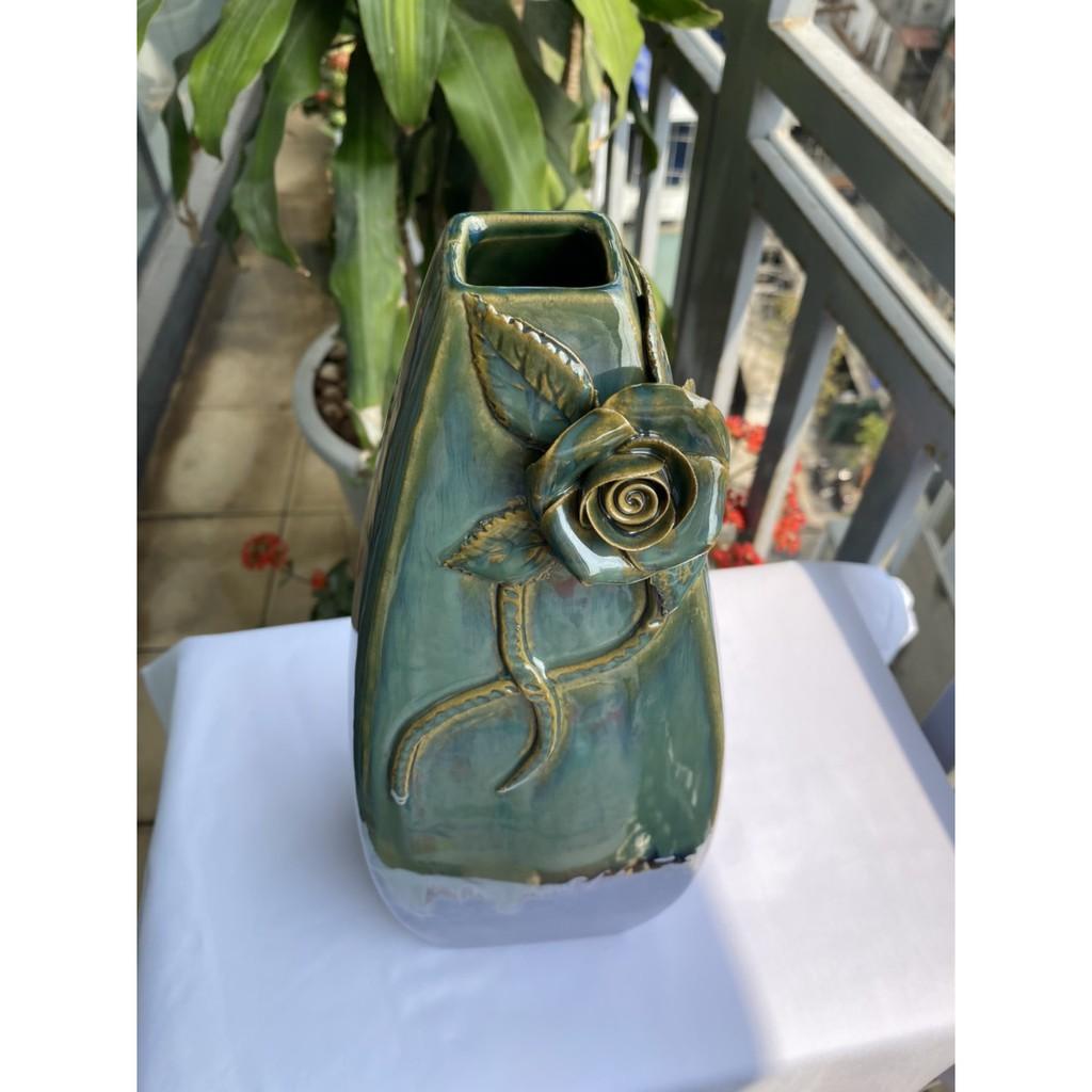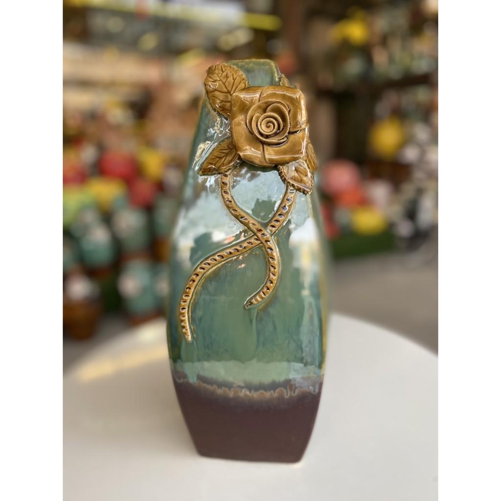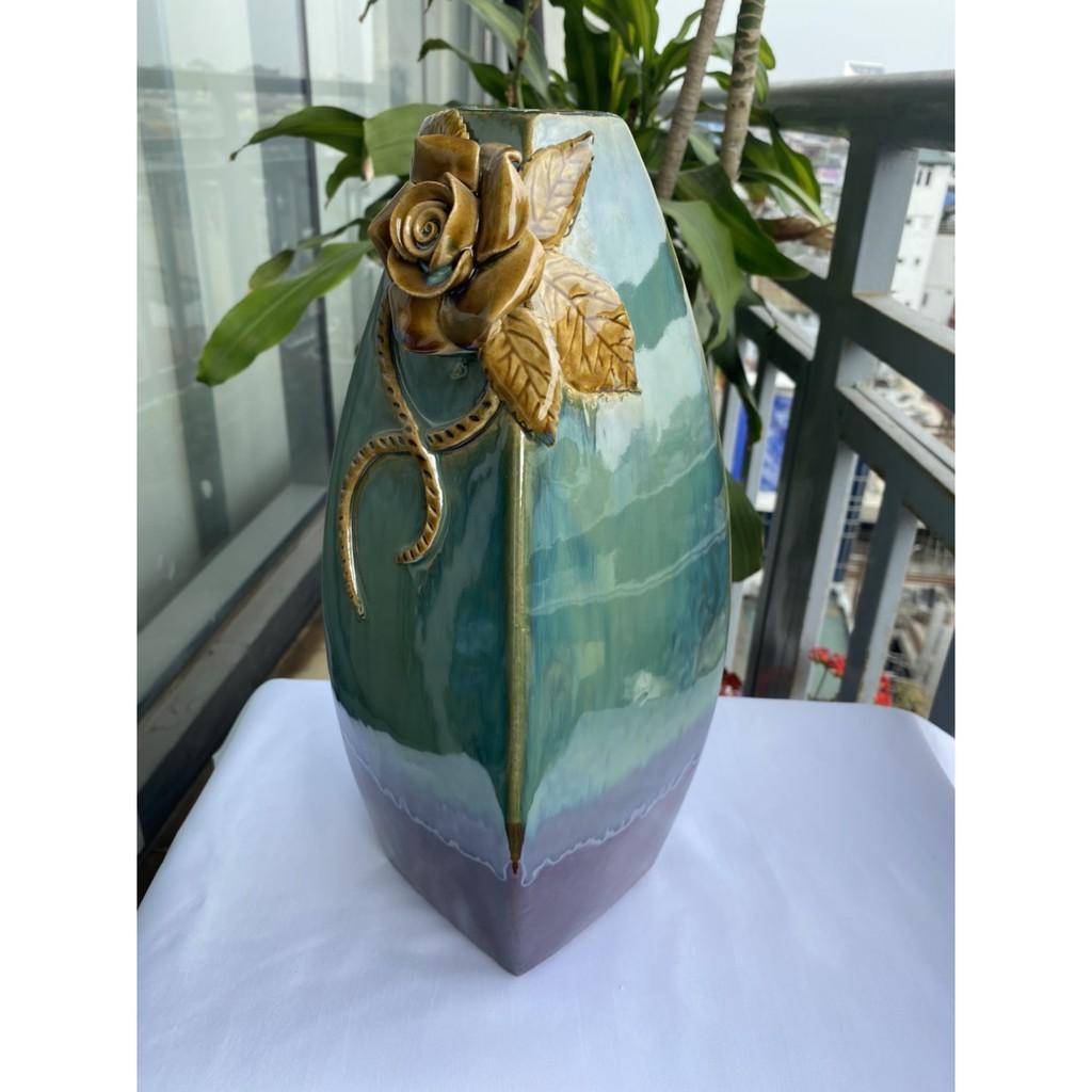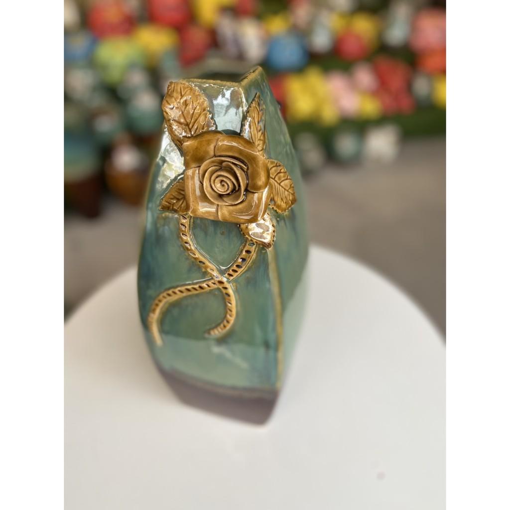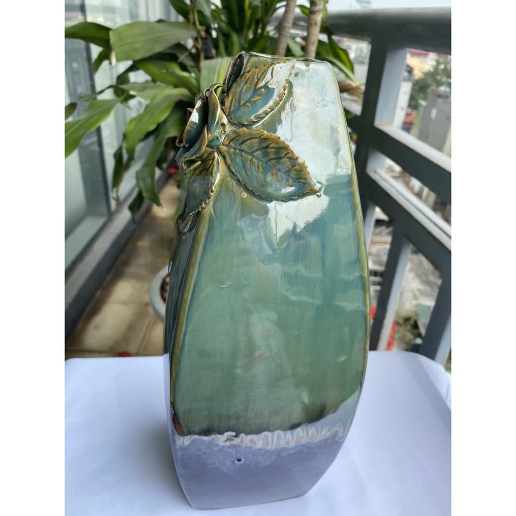 Mua tại TiktokBình hoa Bát Tràng cao cấp loại 1, dáng quả trám lạ mắt với phần họa tiết hoa hồng được đắp nổi ở miệng bình tạo nên một tổng thể hài hòa, ấn tượng. Sản phẩm với nước men hỏa biến xanh phối nâu lạ mắt, màu men được nung ở nhiệt độ phù hợp nên sáng bóng, mịn màng. Bình hoa phù hợp với cắm cành cứng như lựu, mộc lan, mai vàng, hồng, giúp trang trí cho không gian sống trở nên sống động, hấp dẫn, mới mẻ.