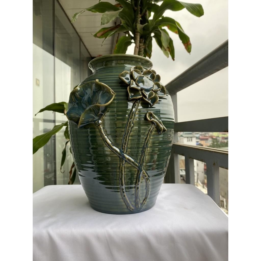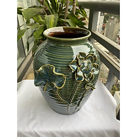 Mua tại TiktokBình hoa cao cấp Bát Tràng, hàng chuẩn loại 1, dáng chum họa tiết đắp nổi được thực hiện thủ công 100% bởi bàn tay lành nghề của các nghệ nhân làng nghề. Sản phẩm với màu men xanh rêu độc đáo, nước men sáng loáng, bóng mịn có thể soi gương được. Bình hoa phù hợp với nhiều loại hoa khác nhau, dễ dàng trưng bày ở nhiều không gian khác nhau như phòng khách, phòng làm việc, phòng ngủ, văn phòng công ty, cửa hà giúp tạo nên một không gian trang nhã, sang trọng, đẳng cấp. Sản phẩm cao 33cm, miệng bình 14cm, vòng bụng bình 73cm