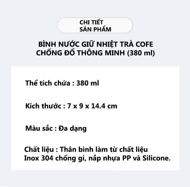 CHI TIẾT SẢN PHẨM Dung tích: 380ml Chất liệu: Inox 304, nhựa PP và Silicone Chiều cao bình: 14.4 cm Màu sắc: Đen, Trắng, Xanh, Đỏ Giữ nhiệt ít nhất 6 tiếng Kiểu dáng thiết