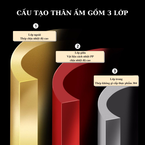 - Chức Năng chống nóng và bỏng với cấu tạo 3 lớp, lớp trong cùng làm từ inox 304 đúc nguyên khối, Lớp ở giữa là nhựa PP cách nhiệt giúp giảm nóng, Lớp ngoài cùng là inox màu tự nhiên cao cấp.