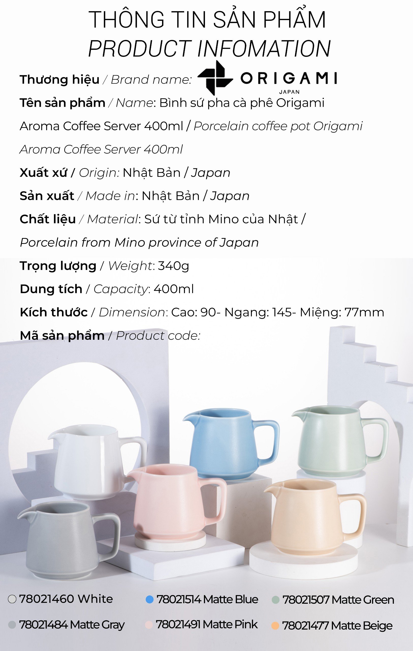 THÔNG TIN KỸ THUẬT BÌNH PHỤC VỤ ORIGAMI AROMA 400ML