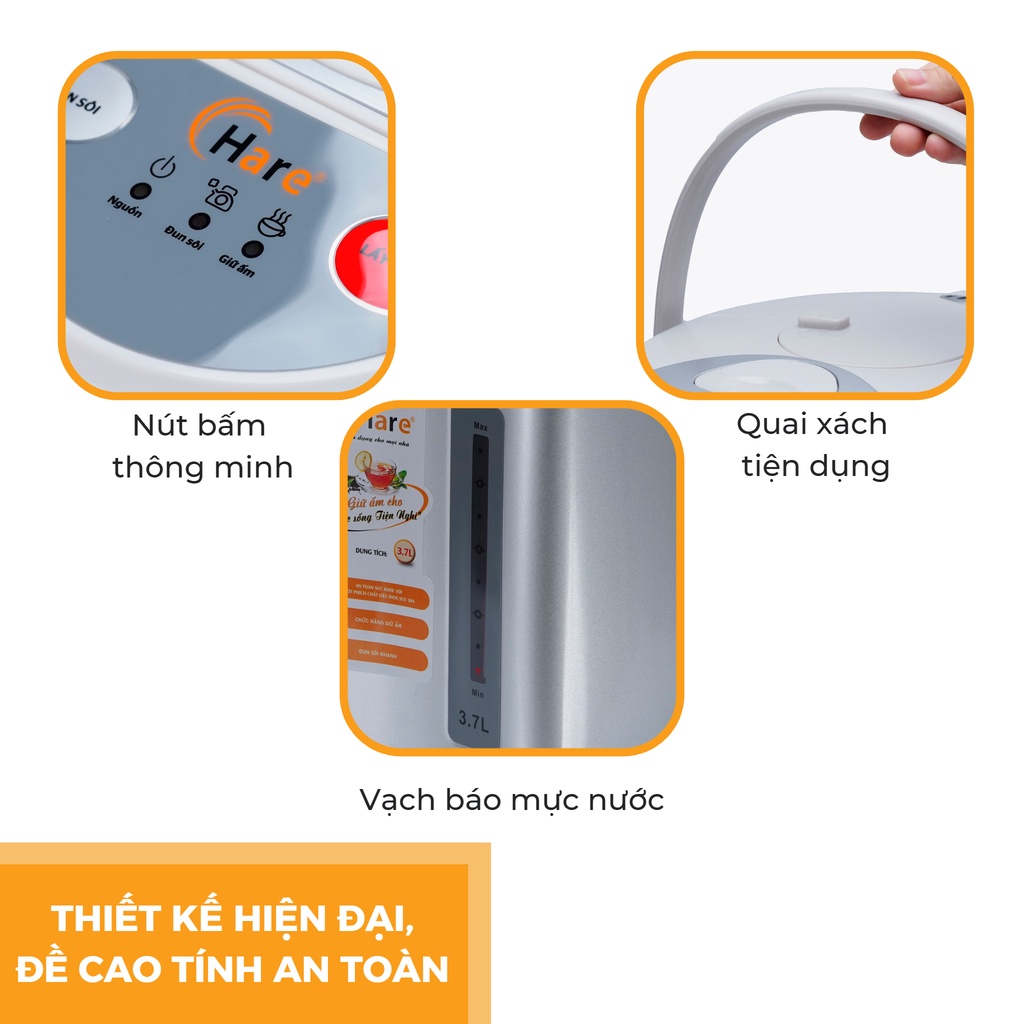 Thông số kỹ thuật: Tên sản phẩm: Bình thủy điện HR-AP3701 Thương hiệu: Hare Mã sản phẩm: HR-AP3701 & HR-AP4301 Điện áp: 220V Công suất: 750W Dung tích: 3.7L & 4.3L Trọng lượng: 2.4kg &