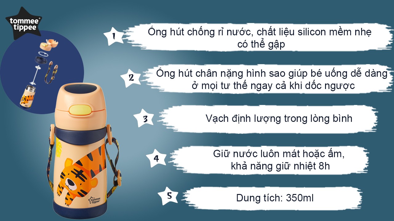 Đặc điểm bình uống nước Inox giữ nhiệt có ống hút và quai treo Tommee Tippee: