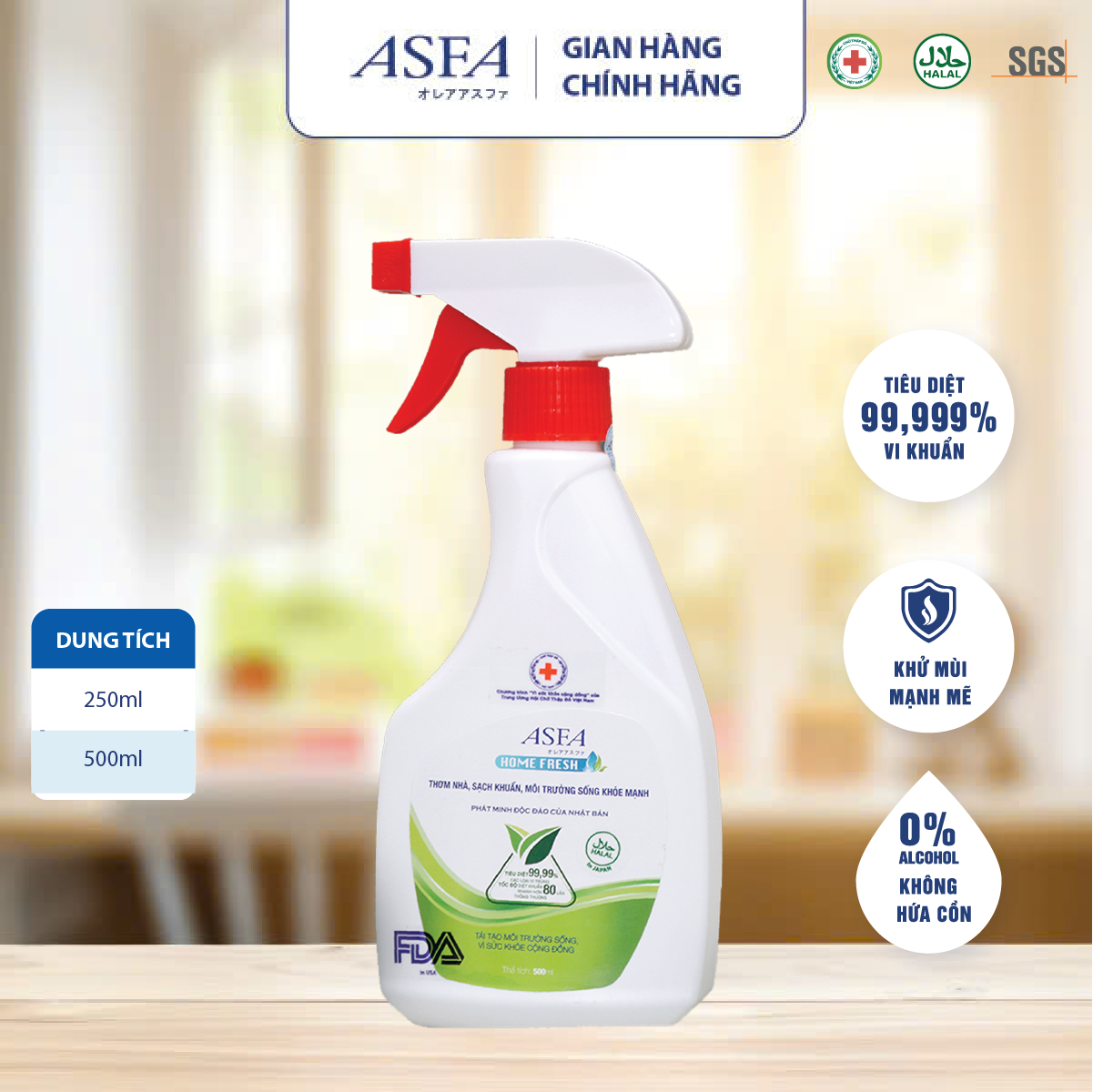 Mua tại TiktokVới tính năng khử trùng và khử mùi mạnh mẽ nhanh chóng, nước ASFA Home Fresh sử dụng để khử trùng và khử mùi ở gia đình rất hiệu quả, an toàn tạo môi trường sống trong sạch thơm tho. Giới thiệu : Khử trùng, khử mùi, tiêu ngăn ngừa nấm men, nấm mốc ở môi trường sống như văn phòng, phòng làm việc, phòng ngủ, nhà bếp, nhà vệ sinh, tủ lạnh, lò vi sóng… Khử trùng và khử mùi các vật dụng hàng ngày như bàn ghế, giường ngủ, khử trùng đồ chơi trẻ em, giày, nón bảo hiểm, túi xách… Đặc biệt hiệu quả trong việc khử các mùi khó chịu trong sinh hoạt ở văn phòng, gia đình, nhà hàng, khách sạn, bếp, tủ lạnh, toilet, xe hơi, chuồng thú nuôi… Tiêu diệt các vi khuẩn, nấm mốc, nấm men có hại giúp bảo vệ sức khỏe.