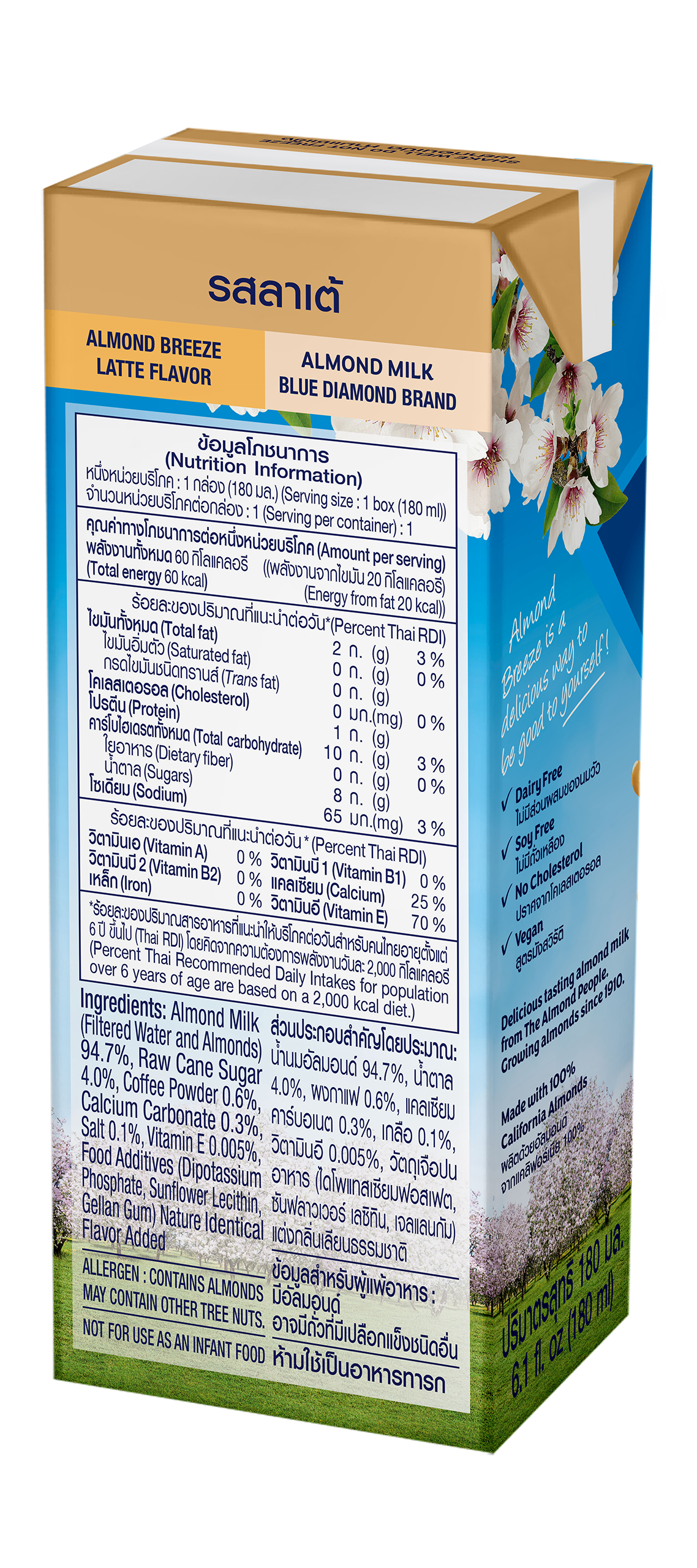 ALMOND BREZZE tự hào là sản phẩm sữa hạt hạnh nhân có SẢN LƯỢNG TIÊU THỤ SỐ 1 TẠI MỸ và vinh dự là SẢN PHẨM SỮA HẠT DUY NHẤT được phục vụ trong bữa chính TRÊN CHUYẾN BAY KHAI TRƯƠNG TRỰC TIẾP ĐẦU TIÊN VN98 TỪ VIỆT NAM SANG MỸ. ALMOND BREZZE tự hào là sản phẩm sữa hạt hạnh nhân có SẢN LƯỢNG TIÊU THỤ SỐ 1 TẠI MỸ. ALMOND BREEZE LATTE sành điệu với tinh chất cà phê Robusta đánh thức các giác quan giúp bạn khởi động ngày mới đầy phấn khởi Sữa hạt hạnh nhân ALMOND BREEZE (Sản phẩm của Tập đoàn BLUE DIAMOND – Mỹ) là thức uống bổ dưỡng hàng ngày tốt cho sức khỏe. Đặc biệt THÍCH HỢP VỚI KHÁCH HÀNG BỊ DỊ ỨNG VÀ KHÔNG DUNG NẠP ĐƯỢC ĐƯỜNG SỮA (Lactose); những người ăn chay; phụ nữ mang thai và cho con bú với thành phần dưỡng chất giàu Canxi và Vitamin E; không Cholesterol và không chứa các thành phần từ đậu nành và sữa. Chiết xuất hạnh nhân lên đến 94% ALMOND BREEZE LATTE giúp bạn cảm nhận trọn vẹn tinh túy chất lượng hạnh nhân từ Mỹ. Sữa hạt hạnh nhân ALMOND BREEZE là sản phẩm sữa hạt tốt cho sức khỏe của bạn và gia đình bạn vì: