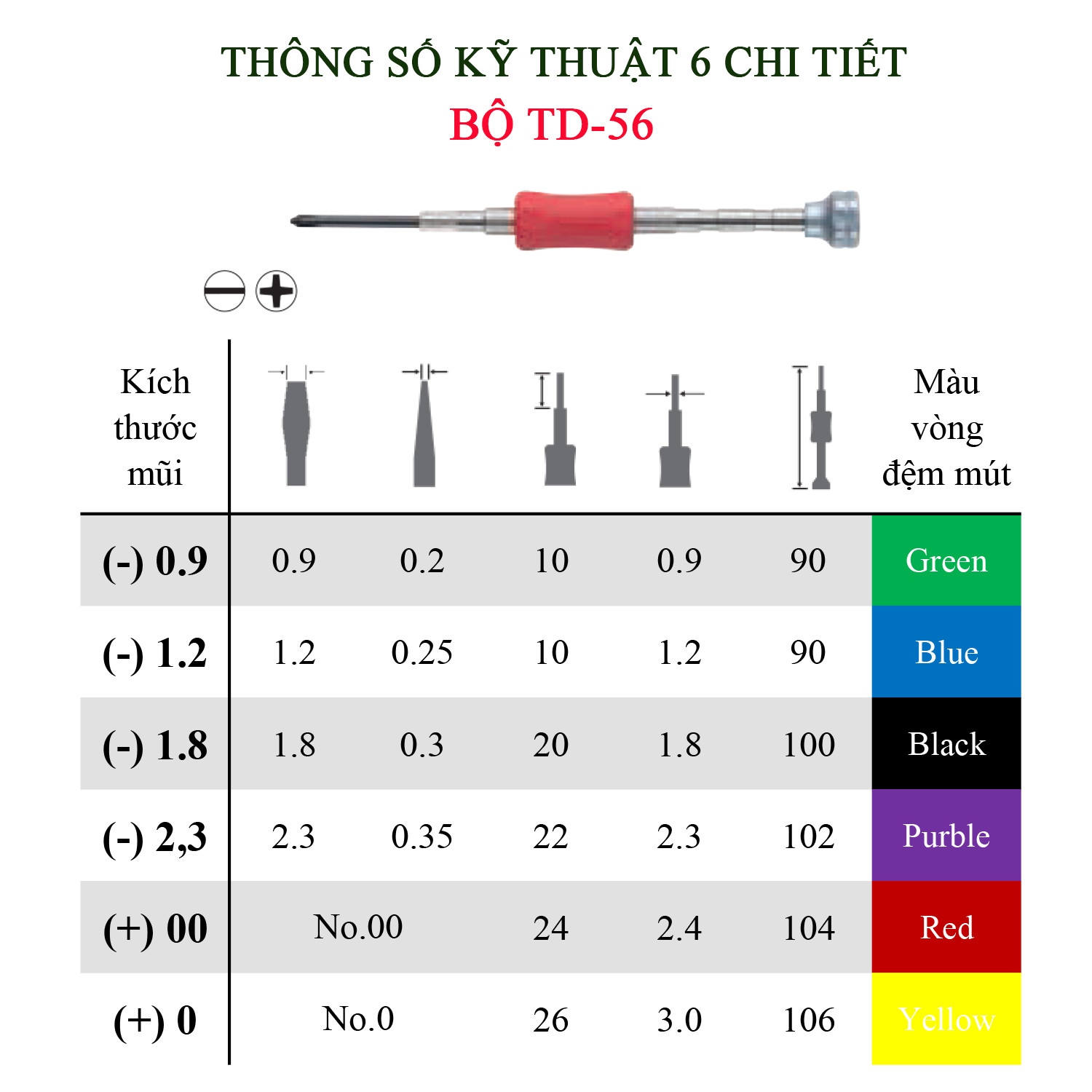 Bộ tô vít chính xác Vessel TD-56 hay còn gọi là bộ tua vít điện tử siêu nhỏ Vessel TD-56 gồm 6 tô vít siêu nhỏ với đầu tô vít (-0.9/-1.2/-1.8/-2.3/+00/+0mm) dùng để siết những ốc vít nhỏ chuyên dùng trong sửa máy tính, điện thoại, máy ảnh, đồng hồ, đồ điện tử,…