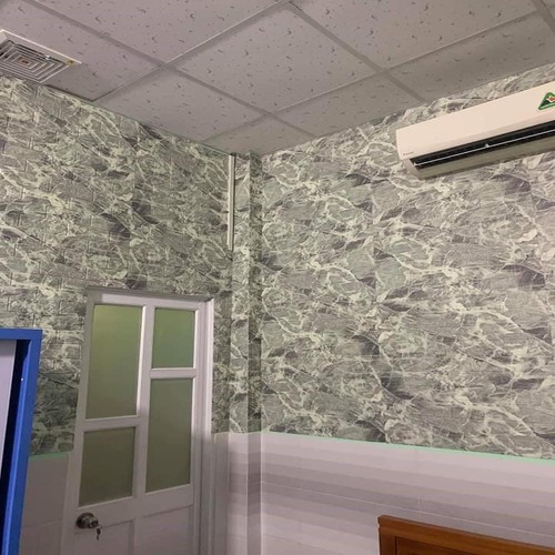 Mẫu giấy dán tường giả đá hoa cương màu trắng này có sẵn keo rồi, khách chỉ cần lột ra dán thôi. Chất liệu bền đẹp, không bám bụi, có thể lau chùi bằng xà