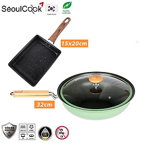 Bộ sản phẩm bao gồm: - 1 Chảo sâu lòng đáy từ 32cm Seoulcook Luxury màu xanh oliu + nắp kính 32cm - 1 Chảo vuông đáy từ Seoulcook 15x20 cm màu đen vân đá