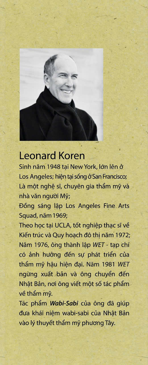 WABI-SABI (I) Cho nghệ sĩ, nhà thiết kế, nhà thơ và triết gia cung cấp một lượng thông tin vừa đủ để phác họa chân dung của wabi-sabi, để người đọc có thể hình dung được một cách vắn tắt nội hàm của khái niệm. Leonard Koren cũng đưa ra nhiều kiến giải mới và thú vị khi đặt wabi-sabi trong tương quan so sánh với chủ nghĩa hiện đại của phương Tây, hay đặt wabi-sabi trong cái khung tư duy theo kiểu mỹ học phương Tây. Ông lý giải sự mơ hồ, không minh định của khái niệm wabi-sabi không chỉ bởi vì bản thân cách tư duy theo kiểu Đông phương, sự ảnh hưởng của Thiền tông mà còn bởi những lý do thực dụng hơn như sự độc quyền lưu truyền Trà đạo của các iemoto trong đời sống Nhật Bản đương đại.