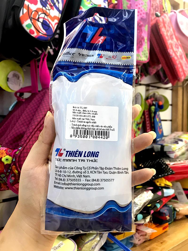 Vỉ 5 Bút Bi TL-097 - Màu Xanh Bút có thiết kế đơn giản, toàn bộ thân bút làm từ nhựa trong, nút bấm bằng nhựa cùng màu với ruột bút. Viết rất trơn, êm, mực ra đều, liên tục. Vỉ 5 Bút Bi Thiên Long TL 079 gồm 5 cây tiện lợi,tiết kiệm chi phí và thời gian mua sắm cho người dùng. Sản phẩm của Thiên Long được nghiên cứu kỹ lưỡng đáp ứng được các tiêu chuẩn của Việt Nam và quốc tế, dựa trên nhu cầu sử dụng và sức khỏe của người tiêu dùng, nên rất thân thiện, an toàn và không độc hại. Đặc tính sản phẩm: - Đầu bi cao cấp: 0.5mm, dạng needle sản xuất tại Thụy Sĩ - Độ dài viết được: 1.000-1.500m - Mực đạt chuẩn: ASTM D-4236, ASTM F 963-91, EN71/3, TSCA - Bút có đầu bấm và lo xo nhạy, bền, không bung, không kẹt, vướng. Lợi ích: - Đầu bi nhỏ tạo nét viết thanh mảnh - Sản phẩm được thiết kế trẻ trung năng động phù hợp cho học sinh, sinh viên Lưu ý : - Bấm lại sau khi sử dụng - Bảo quản nơi khô ráo, thoáng mát .