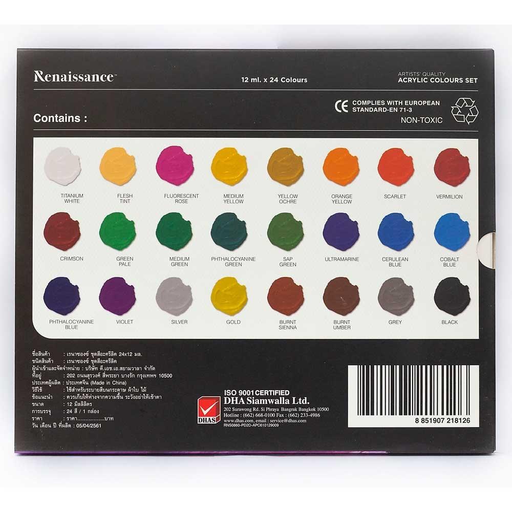 Bộ 24 Màu Vẽ Acrylic Renaissance 12 ml Sản phẩm đến từ thương hiệu mỹ thuật cao cấp hàng đầu Thái Lan - Renaissance. - Khô cực nhanh và chống nước sau khi khô. -