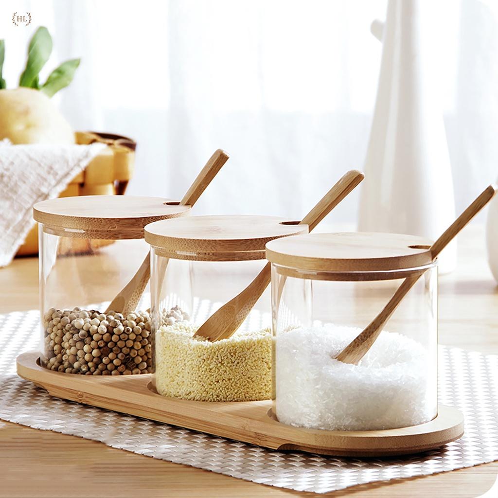 ✨Bộ 3 gia vị thủy tinh kèm khay gỗ tre cao cấp | GIA VỊ 3 THUỶ TINH NẮP GỖ