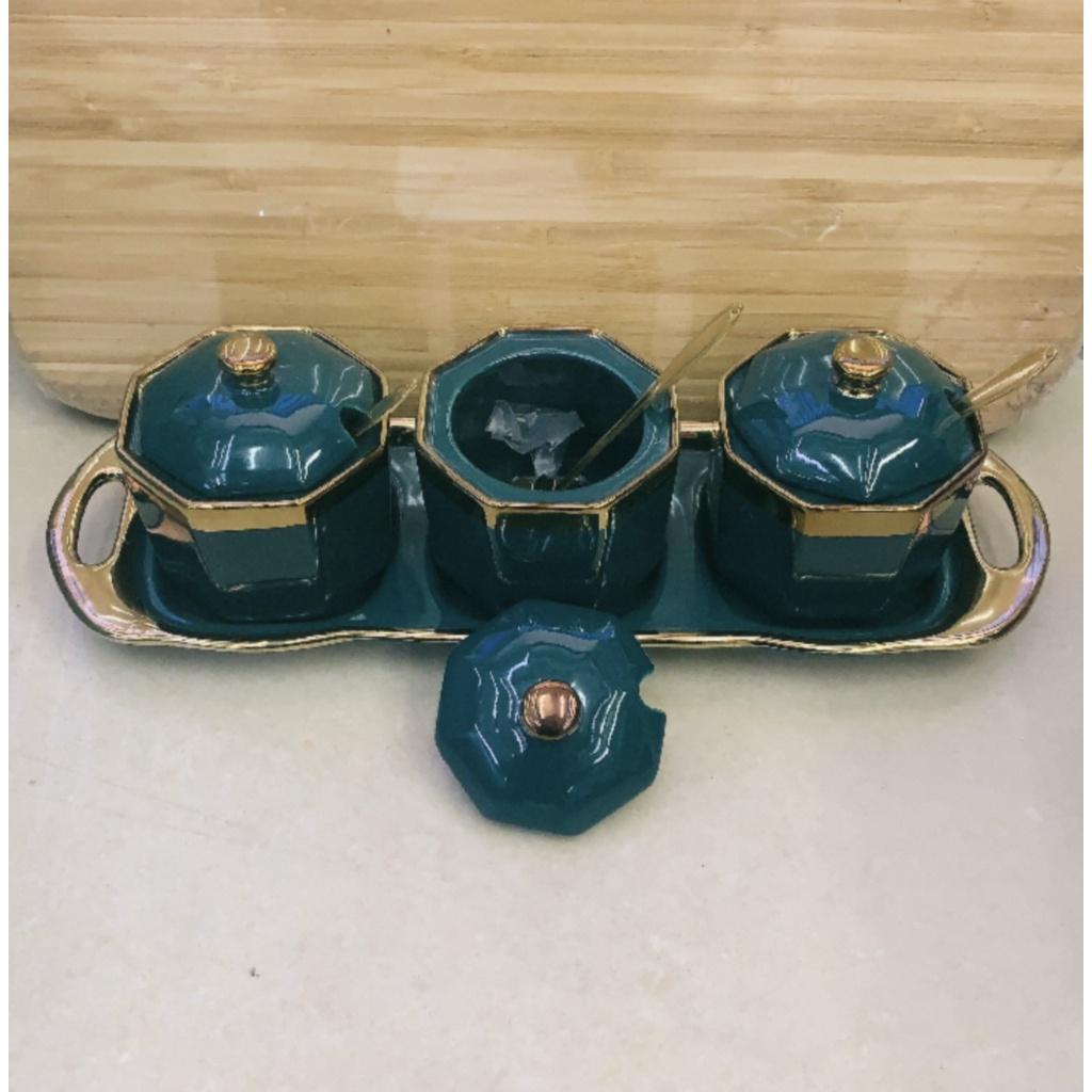 Chất liệu: Sứ Sương - Kẻ viền vàng 18k Điểm nhấn xanh mát cho căn bếp Chất lưọng sứ sương cao cấp Phù hợp với phòng bếp nhà bạn Set bao gồm: 1 đĩa, 3