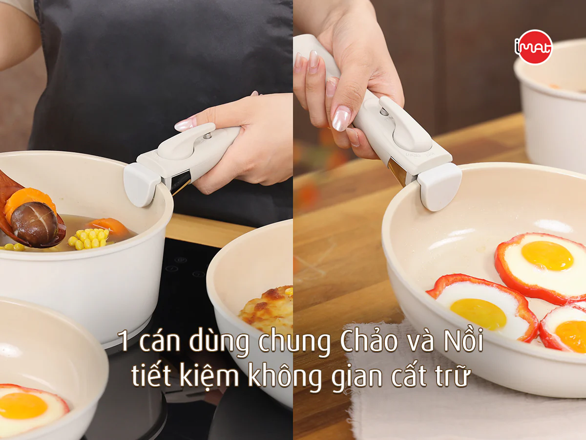 ️ Cán nồi/chảo: Làm từ nhựa Bakelite chịu nhiệt cao, có thể tháo rời, tiện lợi cho việc cất giữ tiết kiệm không gian.