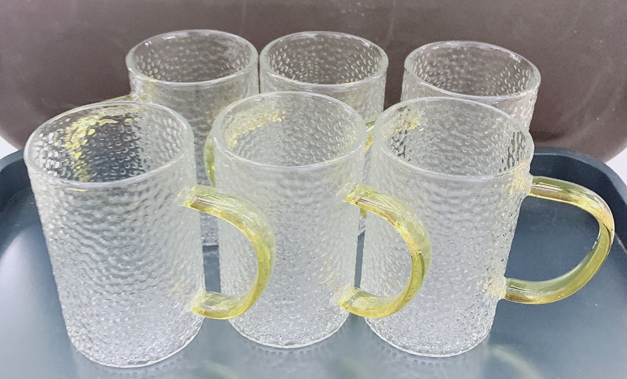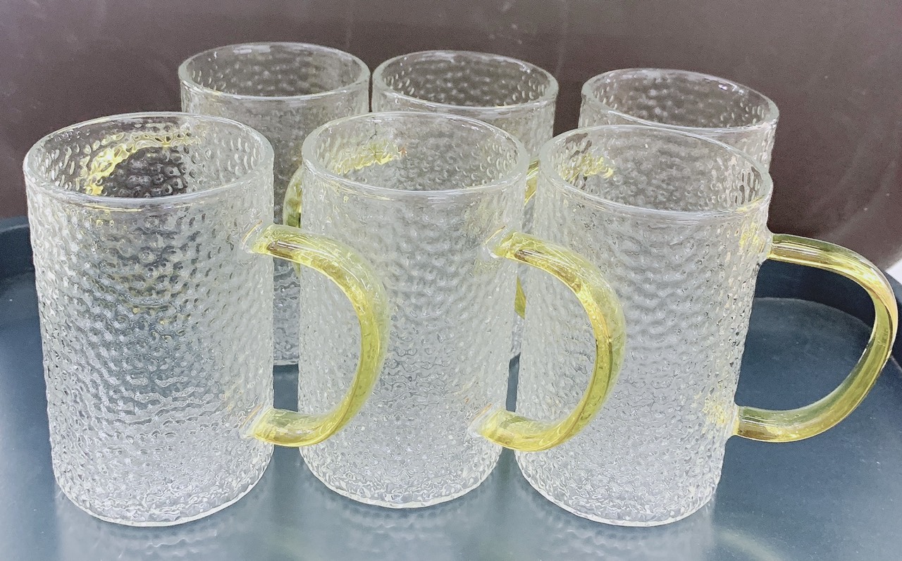 Mua tại TiktokBỘ 6 CỐC THỦY TINH UỐNG NƯỚC CHỊU NHIỆT 350ml CRYSTAN CAO CẤP VÂN DẬP NỔI QUAI VÀNG