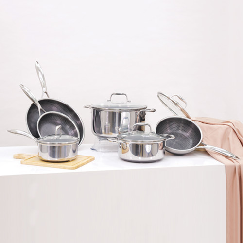 Bộ gồm 6 chiếc: 3 chiếc nồi và 3 chiếc chảo nhiều cỡ. Nồi cỡ từ nhỏ 16cm đến lớn 26cm, 2 chảo chiên và 1 chảo sâu lòng 20cm. Toàn bộ thân nồi chảo đều 3 lớp với họa tiết tổ ong cùng lớp chống dính Sil...
