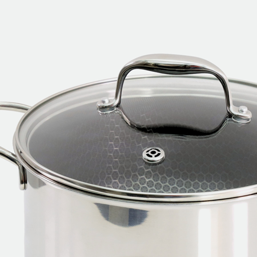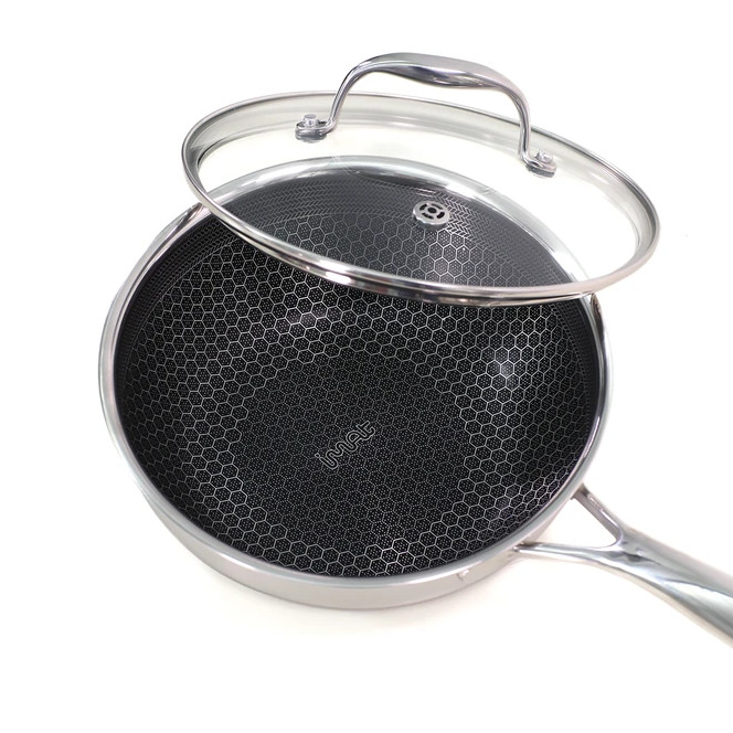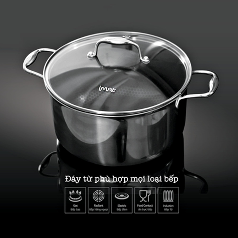 Vung nồi bằng thuỷ tinh chịu nhiệt, trong suốt nên dễ quan sát thực phẩm trong khi nấu. Logo iMat in sắc nét trên vung và đáy nồi.