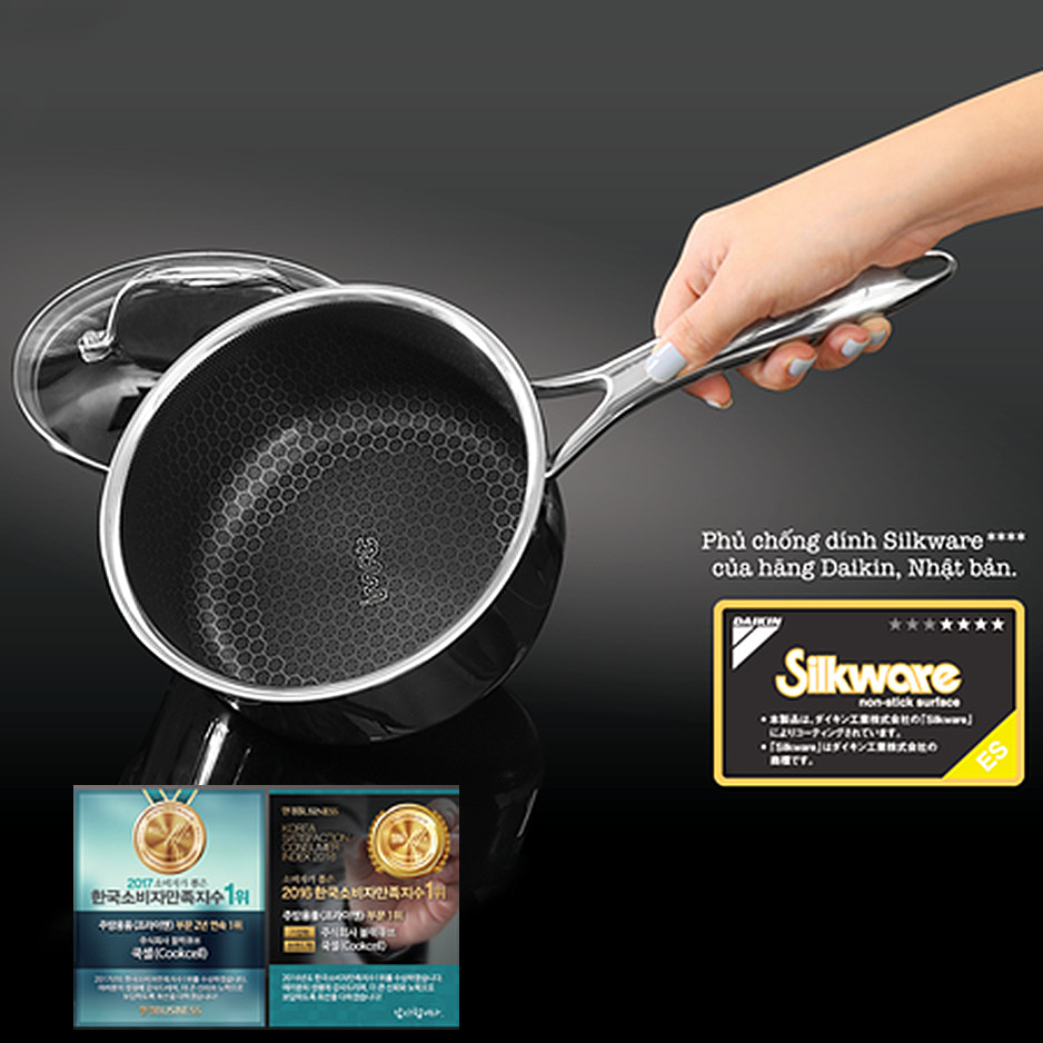 Bộ gồm 6 chiếc: 3 chiếc nồi và 3 chiếc chảo nhiều cỡ. Nồi cỡ từ nhỏ 16cm đến lớn 26cm, 2 chảo chiên và 1 chảo sâu lòng 20cm. Toàn bộ thân nồi chảo đều 3 lớp với họa tiết tổ ong cùng lớp chống dính Silkware, không dính không trầy xước, nấu ăn ngon và tốt cho sức khỏe.